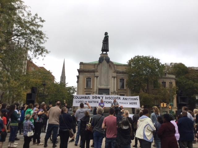“We gather at the statue of Columbus because it is a clear reminder of his legacy of genocide and land theft,” Neighbors of the Onondaga Nation stated on the event page.  “Standing atop the heads of indigenous peoples, located squarely between the Church and Government buildings, located on land stolen from the Onondaga Nation, it is a clear monument to the Doctrine of Discovery, racism, and the oppressive structures of colonialism that continue to affect all of us today.  We gather here during a teachable moment to discuss the ongoing impacts of that legacy and to commit ourselves to reversing it.”