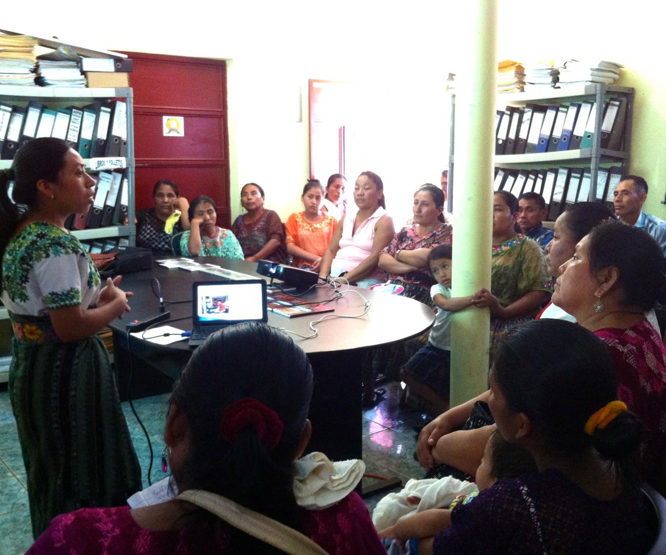 The turnout of the meeting surpassed our expectations. Thirty-six community leaders showed up, almost half of who were women.  We presented on the history of the community radio movement, and the importance of community radio for the promotion of Indigenous culture, community mobilization and development. Angélica, the volunteer from Radio Ixchel, presented on her community radio, including what kind of programs they broadcast, what groups they work with, how they sustain themselves as a non-profit radio, etc.