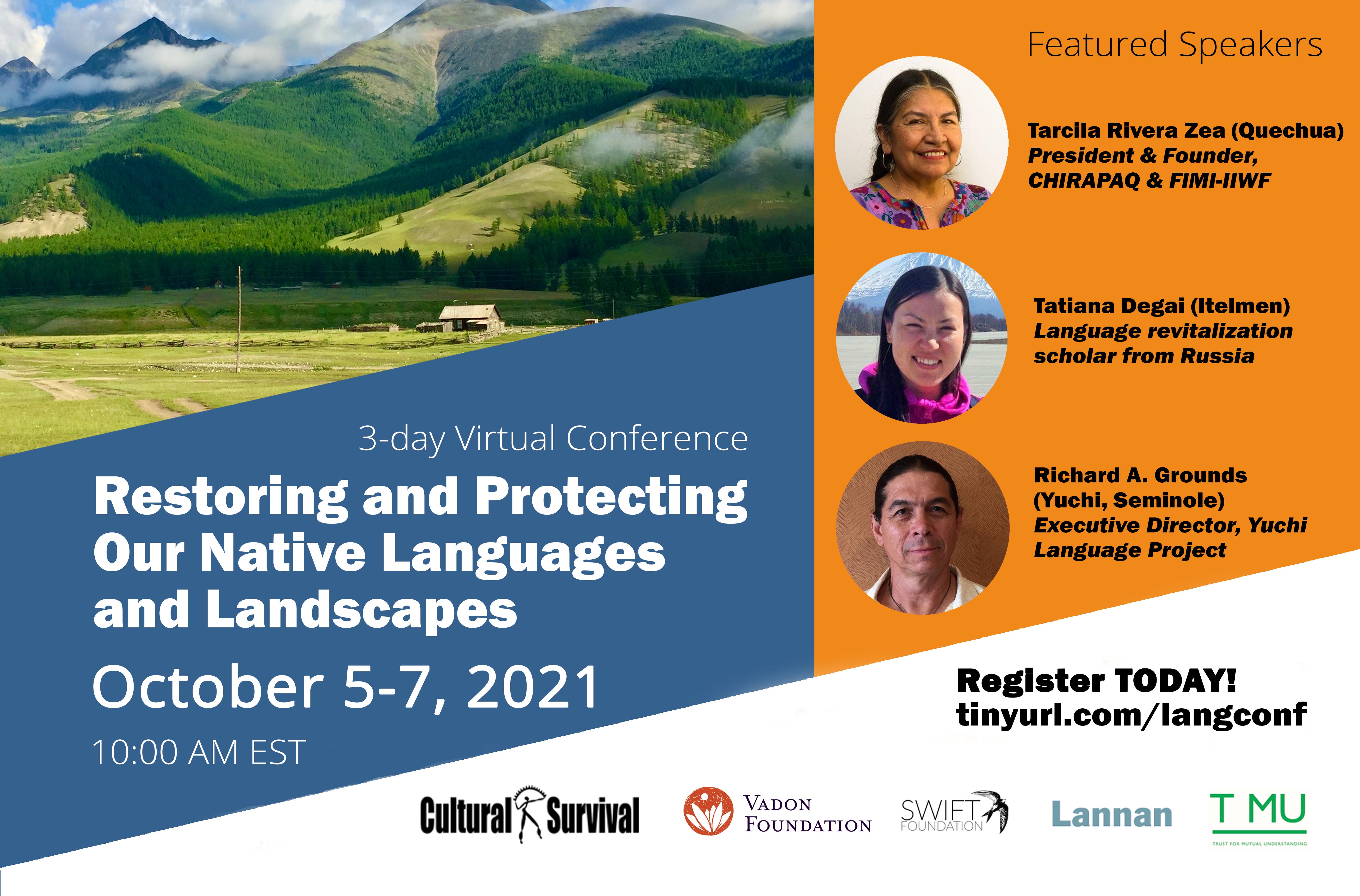 On October 5-7, 2021, in light of the upcoming United Nations International Decade of Indigenous Languages, Cultural Survival is pleased to announce its upcoming 3-day virtual conference, "Restoring and Protecting Our Native Languages and Landscapes.” This conference will equip individuals working at the community level with tools and best practices for revitalizing and strengthening Indigenous languages and the Traditional Ecological Knowledge carried within them.
