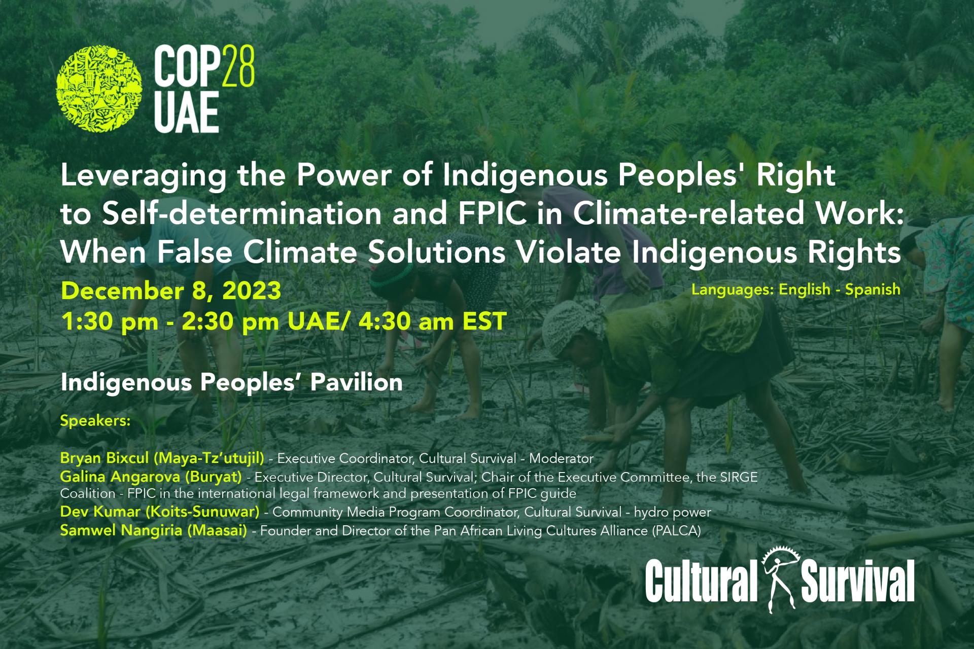 Cultural Survival and partners developed an FPIC guide to support Indigenous Peoples' right to self-determination worldwide. As we continue to witness an onslaught of violations of Indigenous territories in the name of conservation, the just transition, and extractive industries, exercising the right to Free, Prior and Informed Consent remains one of the most powerful tools to protect the rights of Indigenous Peoples. At this session, Indigenous leaders will share experiences of violations of Indigenous rights and will present a new FPIC guidebook to support Indigenous Peoples' self-determination.