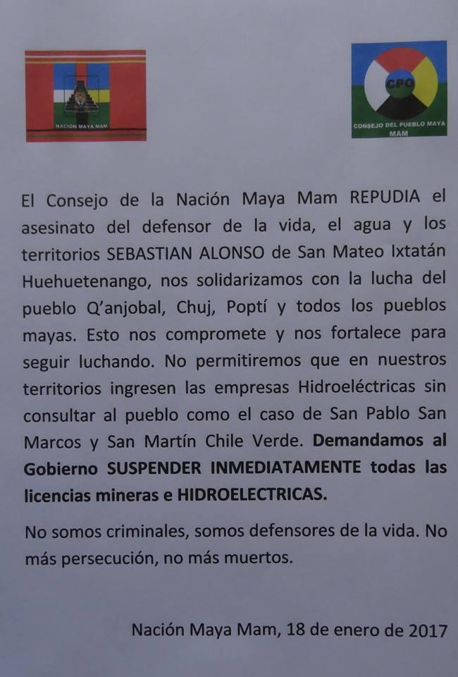 According to Prensa Comunitaria, on January 17, 2017, Sebastián Alonzo Juan (age 72) was killed during manifestations in Yich K’isis, San Mateo Ixtatán, Huehuetenango. “While the population manifested peacefully, according to the population and witnesses, the National Civil Police and private guard of the company began to shoot ... There were also soldiers present in this place. Since morning hours, people had been manifesting in several areas in northern Huehuetenango and there was a concentration of the population who went to the location of the facilities of the company, PDH. Among the demonstration were people who were in favor of the company according to witnesses. When the mobilization had ended and people were returning home, unidentified people burned objects that ended with machinery on fire. In the demonstration were minors, women and seniors. Mr. Sebastían Alonzo Juan was lying 10 meters from the Rio Negro, one of the rivers to be used for the hydroelectric project, located 100 meters from the construction where the dam is going to be built. In the midst of these shots were correspondents of Radio Sembrador, Telesur and Prensa Comunitaria.”