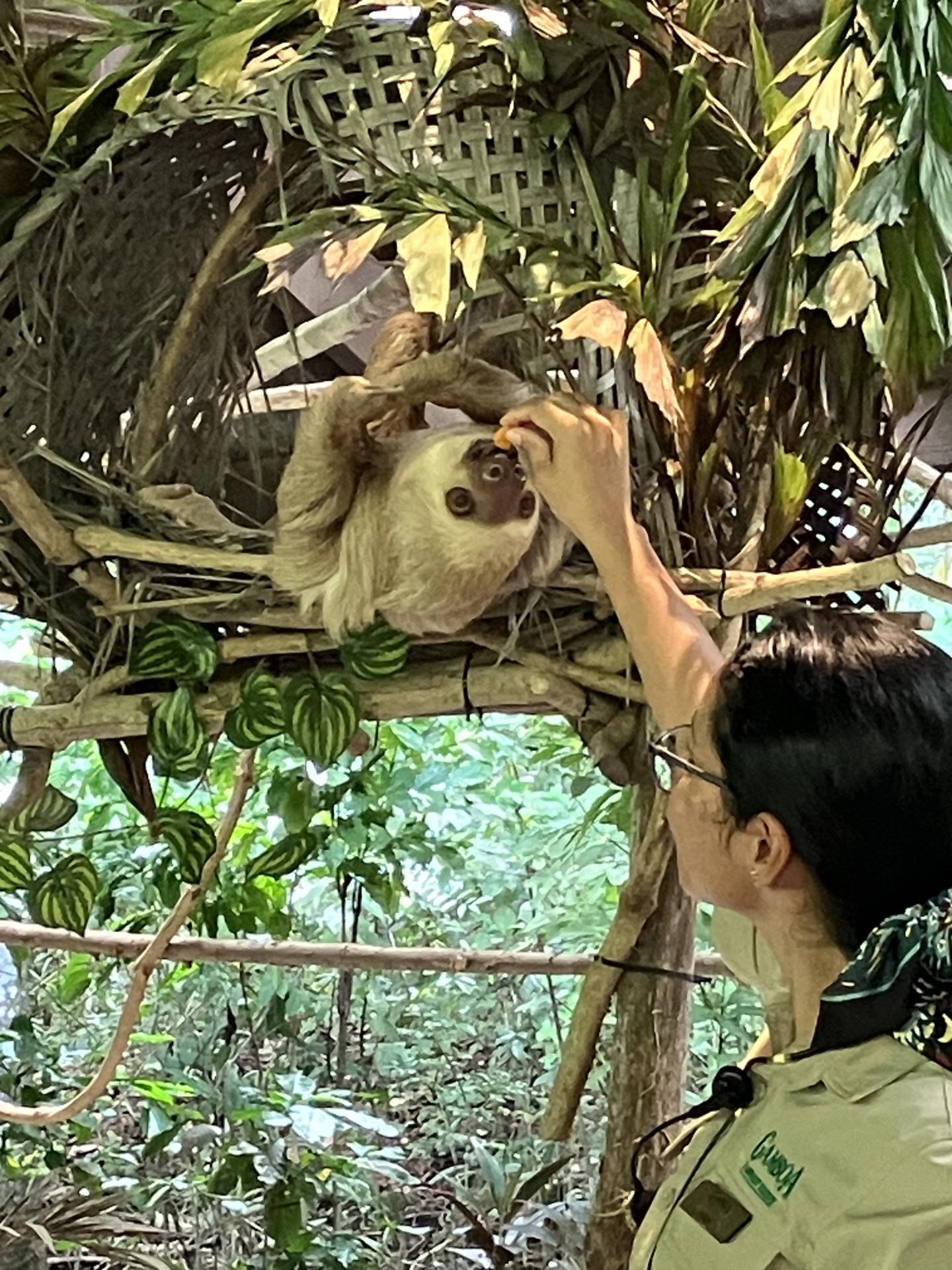A gentle sloth that had been rescued from abuse is now being fed by a caretaker and interpreter at the sanctuary.