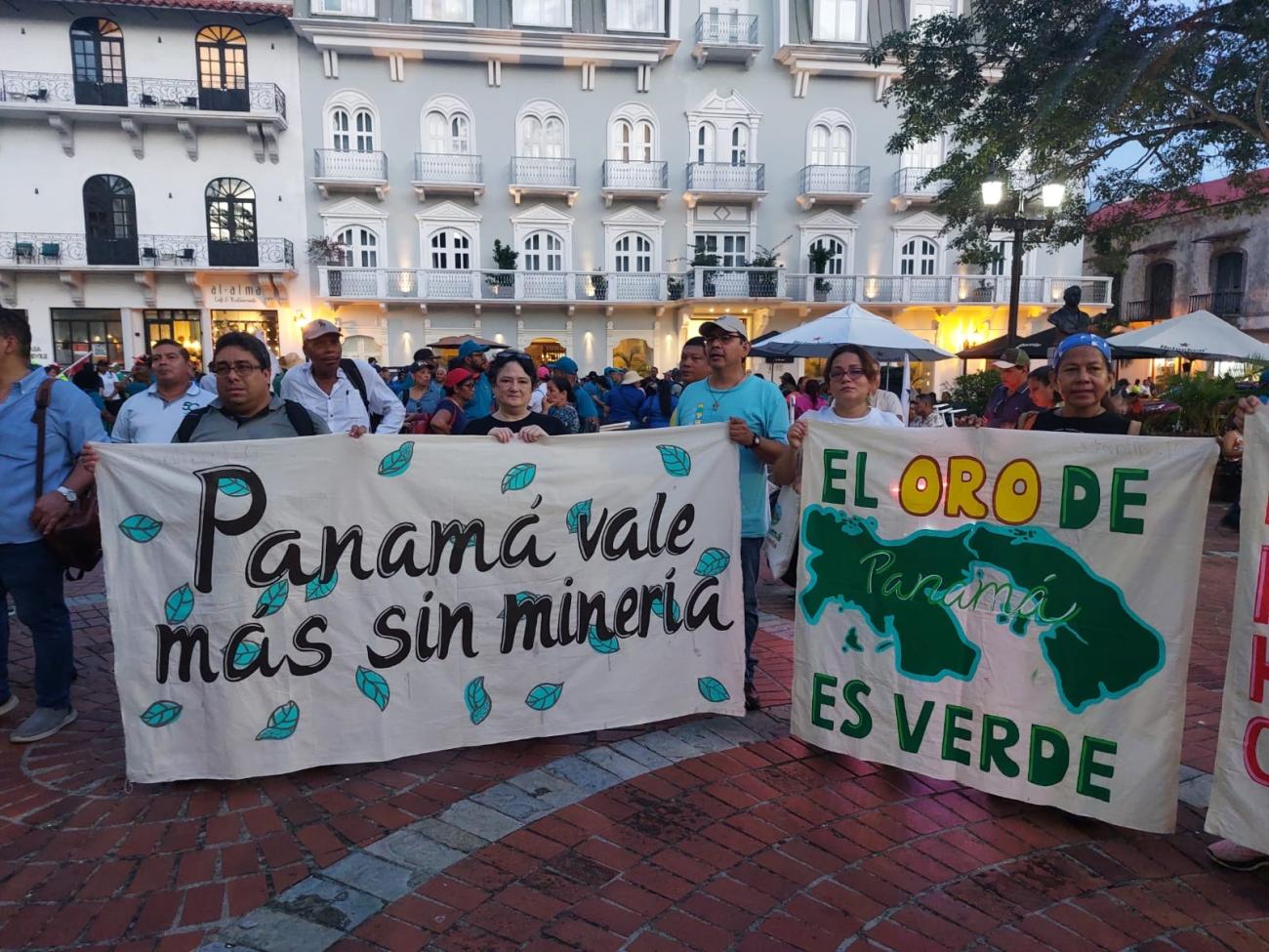Panamanian citizens take to the streets and plazas to advocate for their environment over mining. The banner to left reads, “Panama is worth more without mining.” At right, “[Panama’s] Gold is Green.” Photo by Gilberto "Cholo" Garcia