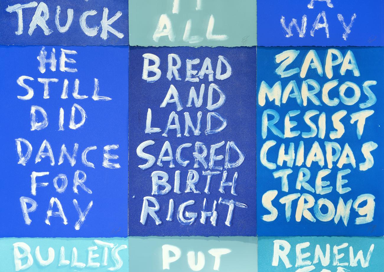 For TEN AT SEVEN, Edgar Heap of Birds exhibited, Diné Body Bag (2010-2017). The inspiration for the title and imagery is a personal, family incident in which a Diné Tribal elder’s body was transported to his funeral in a coroner’s body bag instead of the customary coffin because of family financial hardship. Like much of his work, Diné Body Bag, is an installation of monoprints with texts that call for action, poetic statements that reference injustices, misconceptions about Native Americans, and racist stereotypes, placed against a colorful background, in this case shades of blues. Twelve statements are laid out in a rectangular format, four on each row, made with ink on rag paper. The top row includes the monoprint that refers to the entire works’ title with the statement, “Body Bag in Diné Truck.”