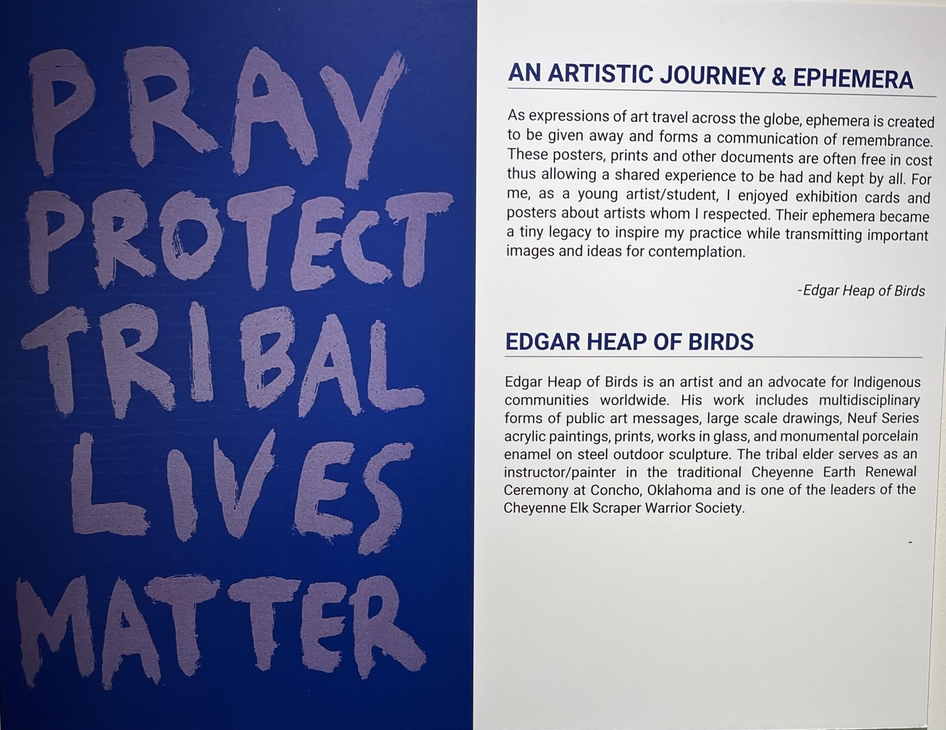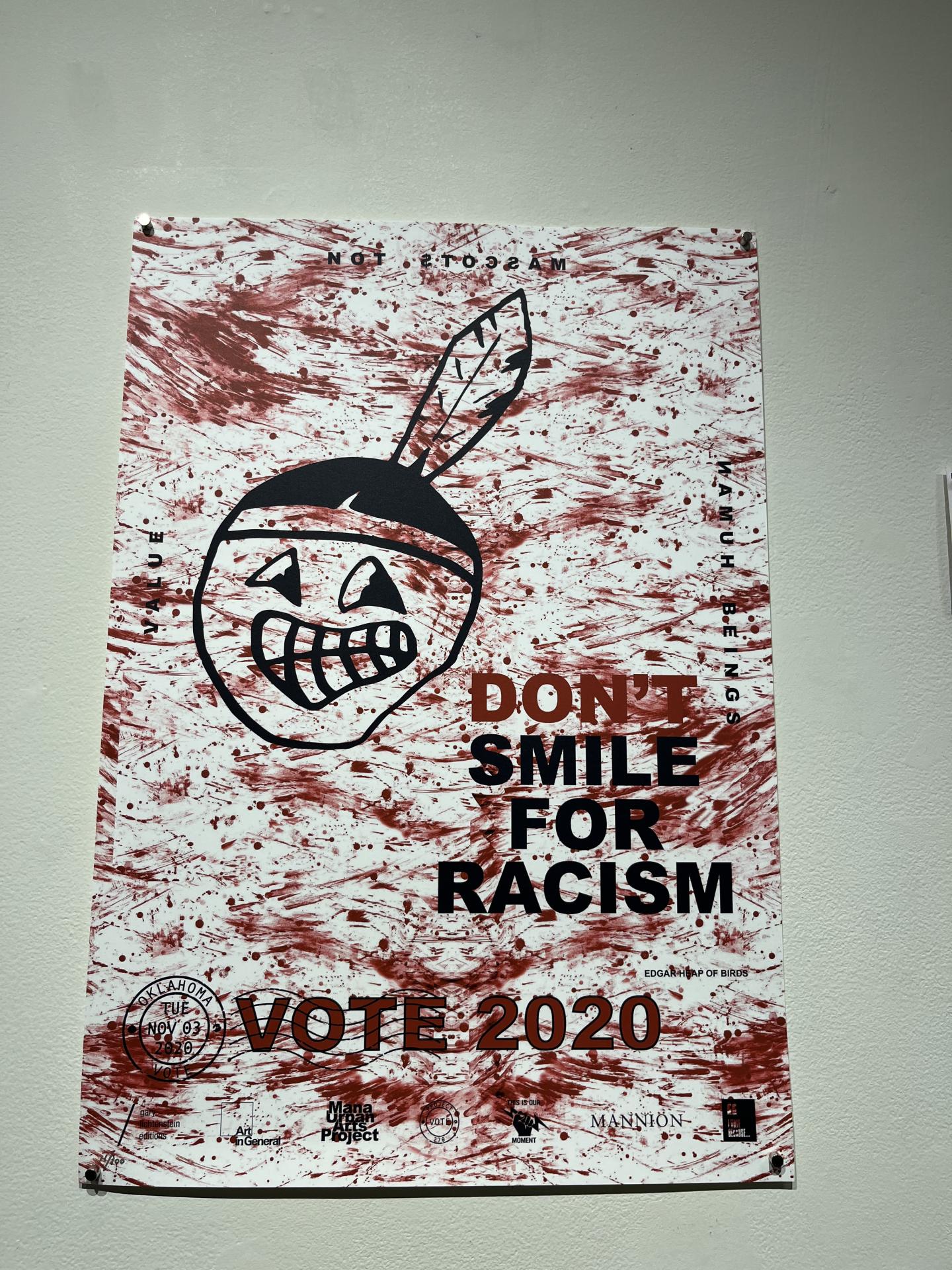 Giving back to one’s community was emphasized in all of Heap of Birds’ interactions at Stockton University. Having earned his MFA at Temple University’s Tyler School of Art and Architecture in Philadelphia, he recently established a residency program there. The Edgar Heap of Birds Family Gallery, which supports Native artists in North America, will offer an artist’s residency every two years. This year’s resident artist is painter Norman Akers (Osage).
