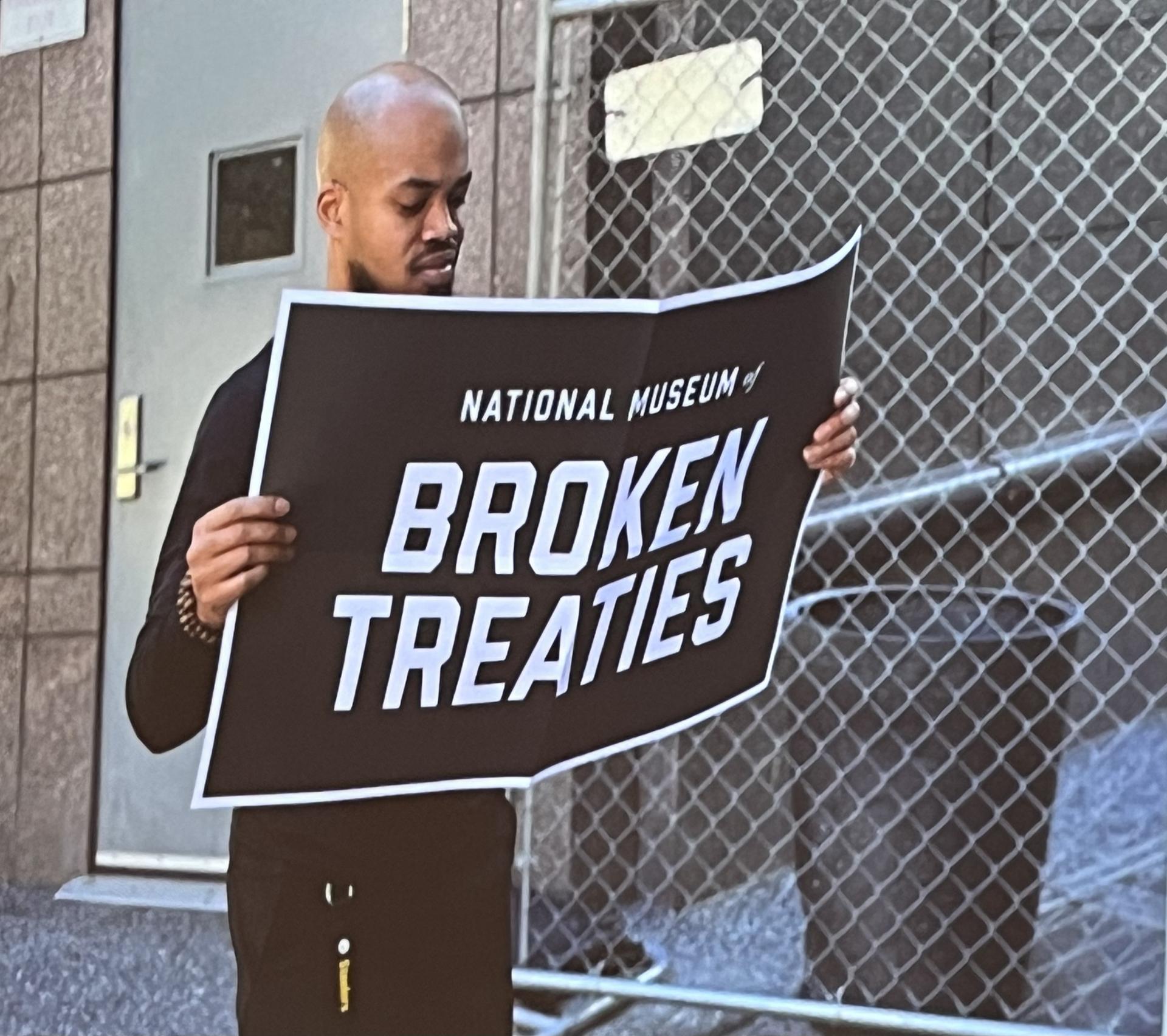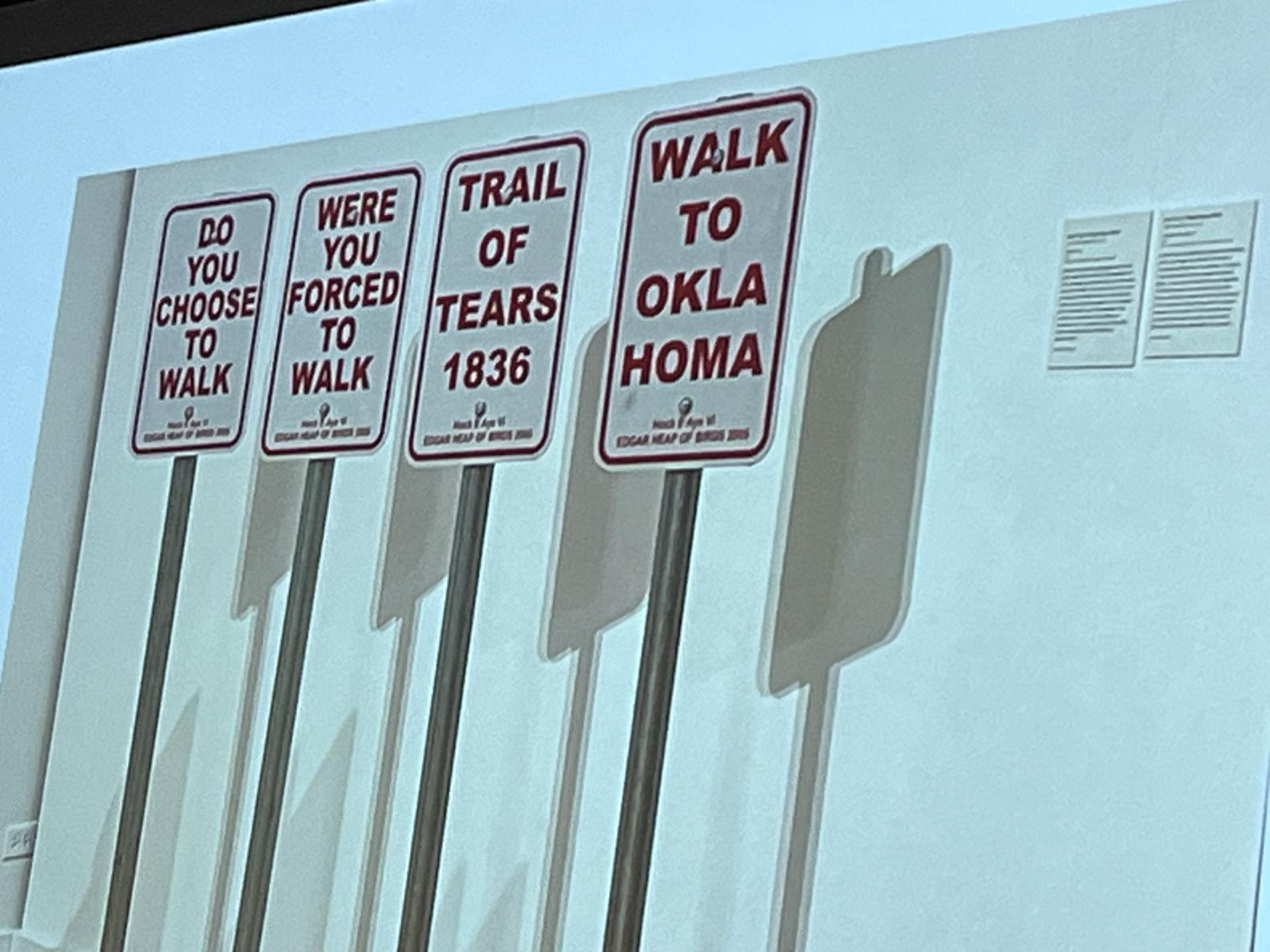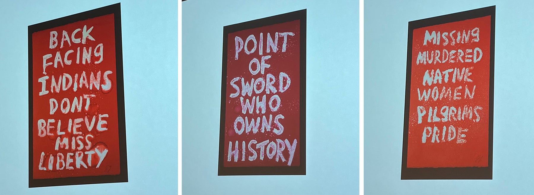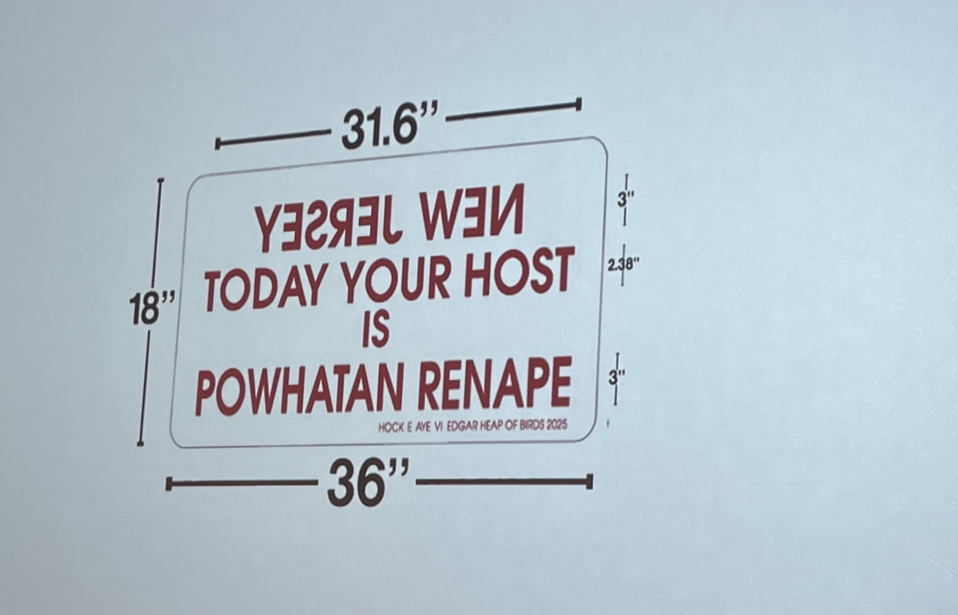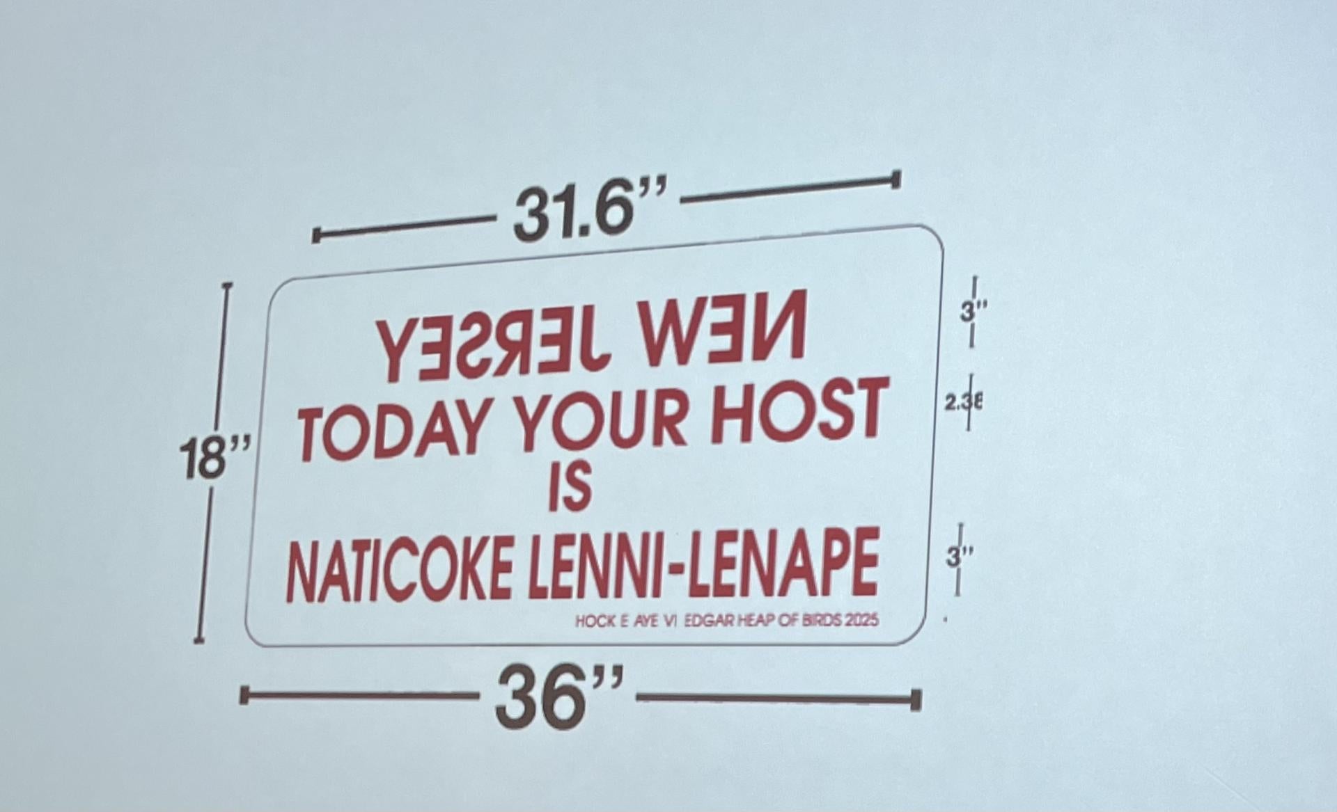Artist Hock E Aye Vi Edgar Heap of Birds (Cheyenne/Arapaho) was the keynote speaker at Stockton University’s annual Arts and Culture Summit on April 4-5, 2025, an event that served as beginning preparation for the United States of America’s 250th anniversary next year. Before his address, Heap of Birds engaged with art students during a lecture and Q&A session at the Stockton University Art Gallery. He was also a participating artist in the university’s art exhibition, “Indigenous Approaches, Sustainable Futures”.