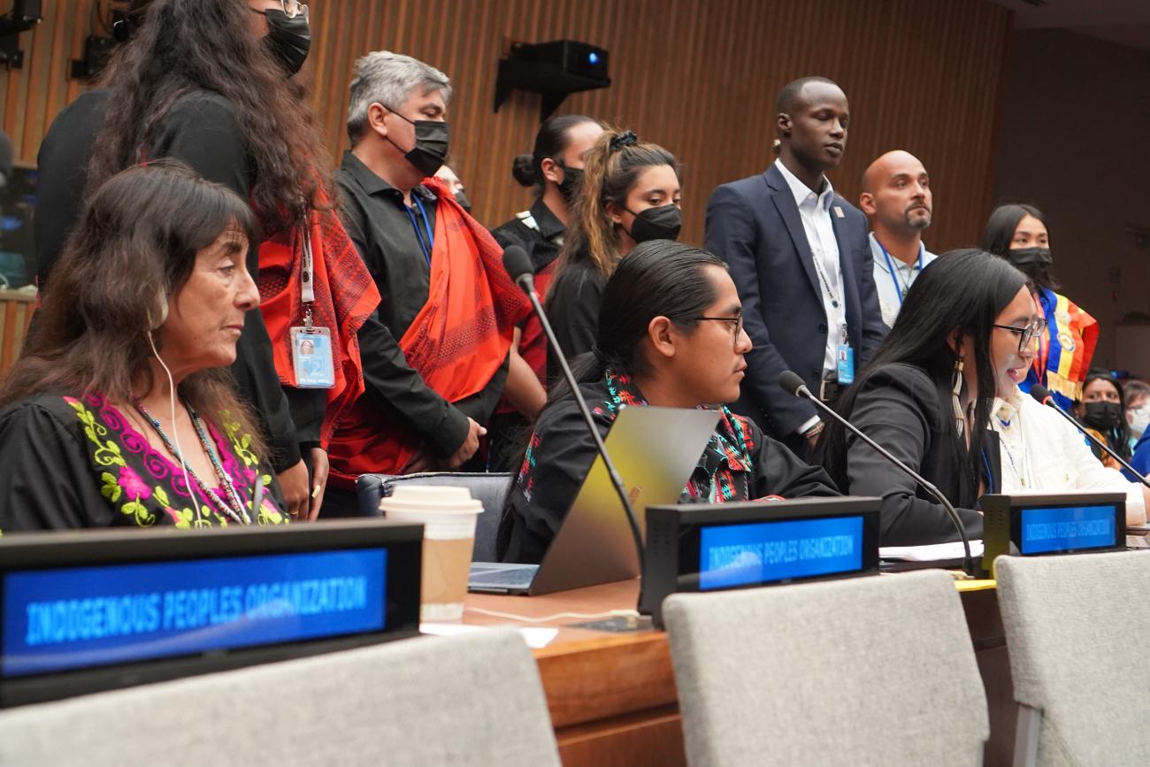 Photo: Global Indigenous Youth Caucus making an intervention at the 21st Session of the UN Permanent Forum on Indigenous Issues.