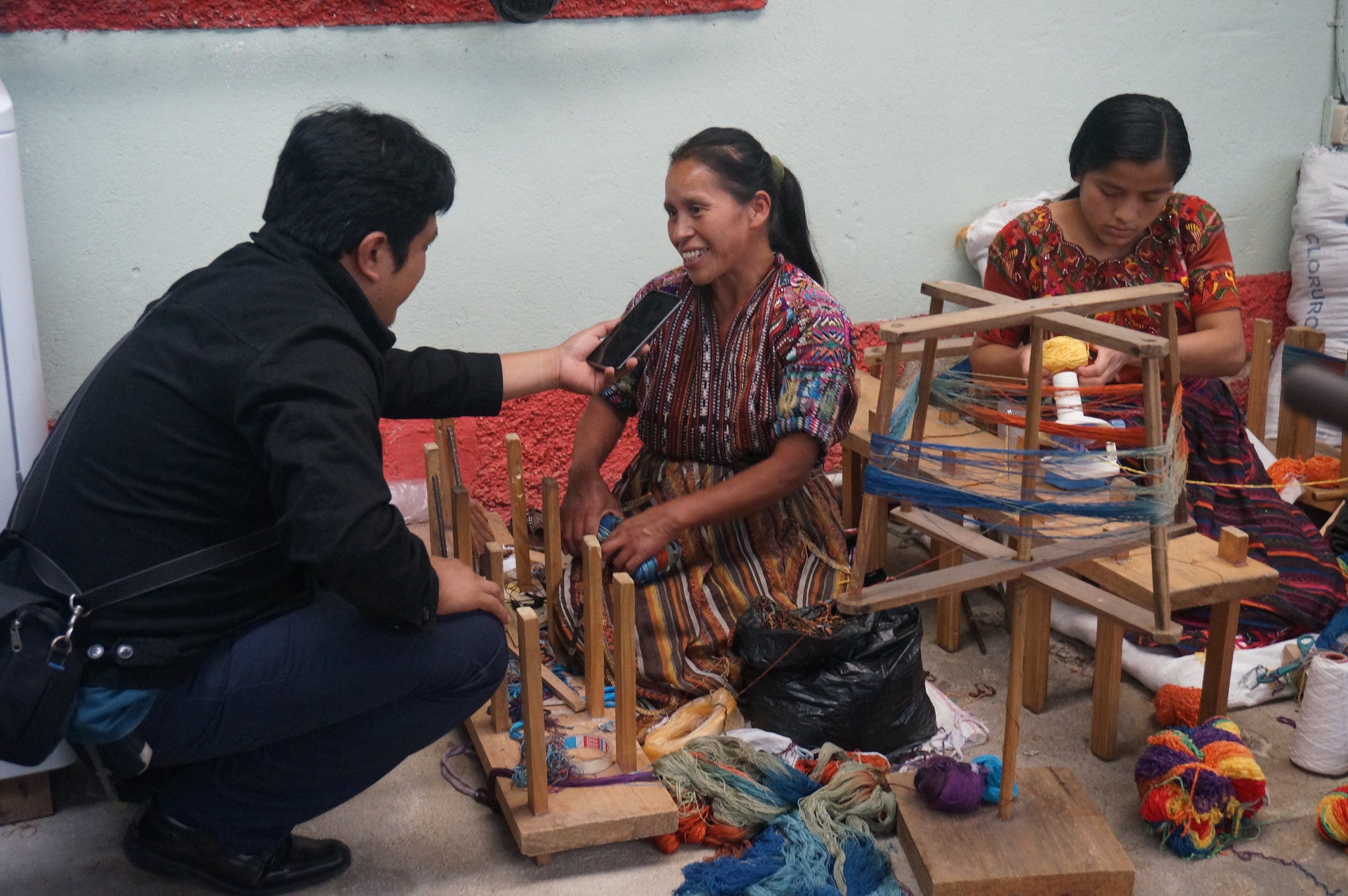 Foto: César Gómez entrevistando a una tejedora de la Asociación Maya en Sololá, Guatemala.