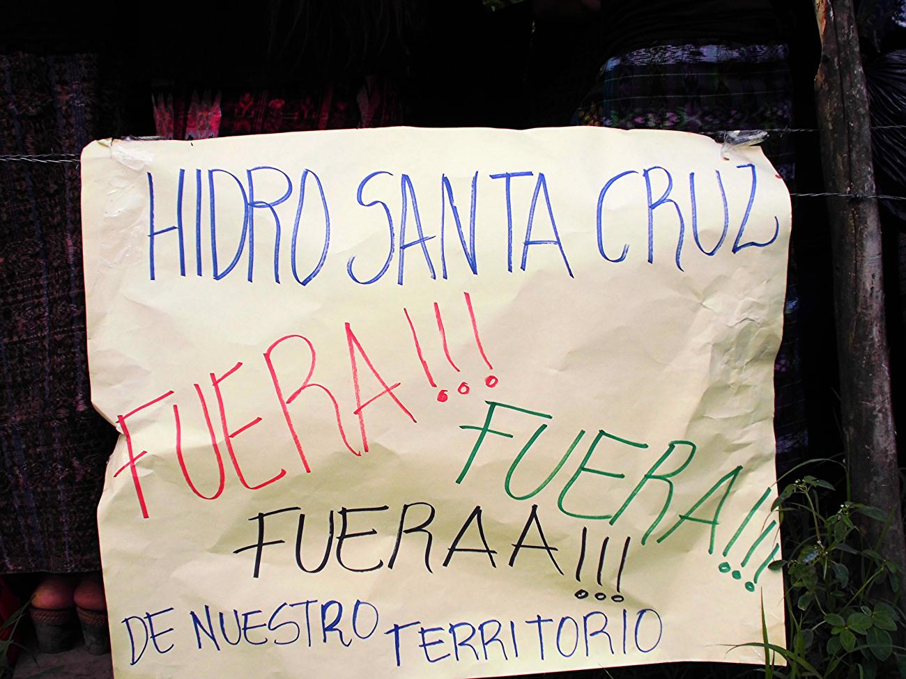 Women of Santa Cruz Barillas holding a sign telling Hidro Santa Cruz to get out of their territory. Photo by Luis Miranda Brugos.