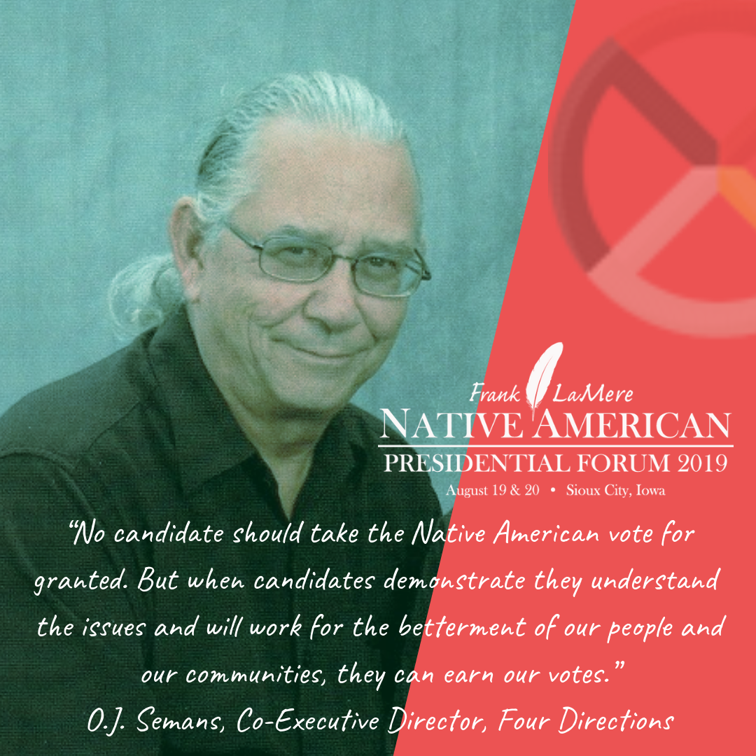 Hosting the event were the Native Organizers Alliance and Four Directions, Inc, a non-profit working to promote voting equality across Indian Country by advocating for voter rights and supporting voter engagement for Native Americans. The forum is called “The Frank LaMere Native American Presidential Forum” in honor of the Native American activist and leader of Four Directions, Frank LaMere, who passed away in June.