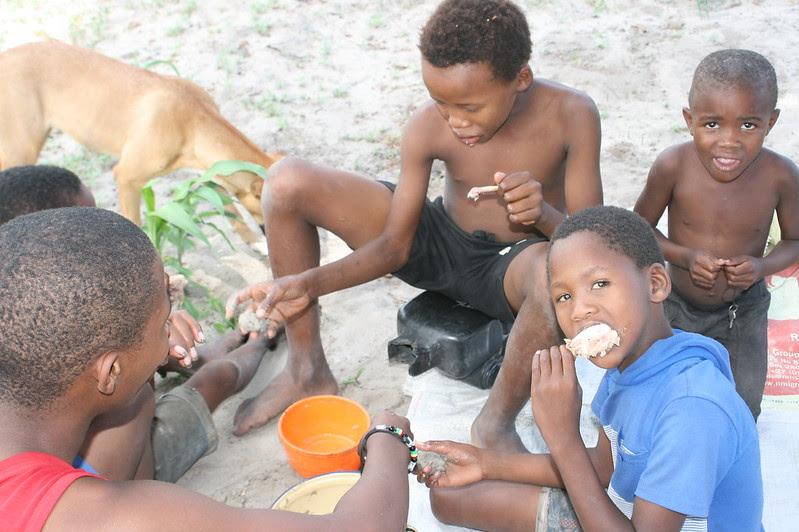 Photo: Bwabwata Khwe boys enjoy a meal. Omega 1 Village, Namibia.