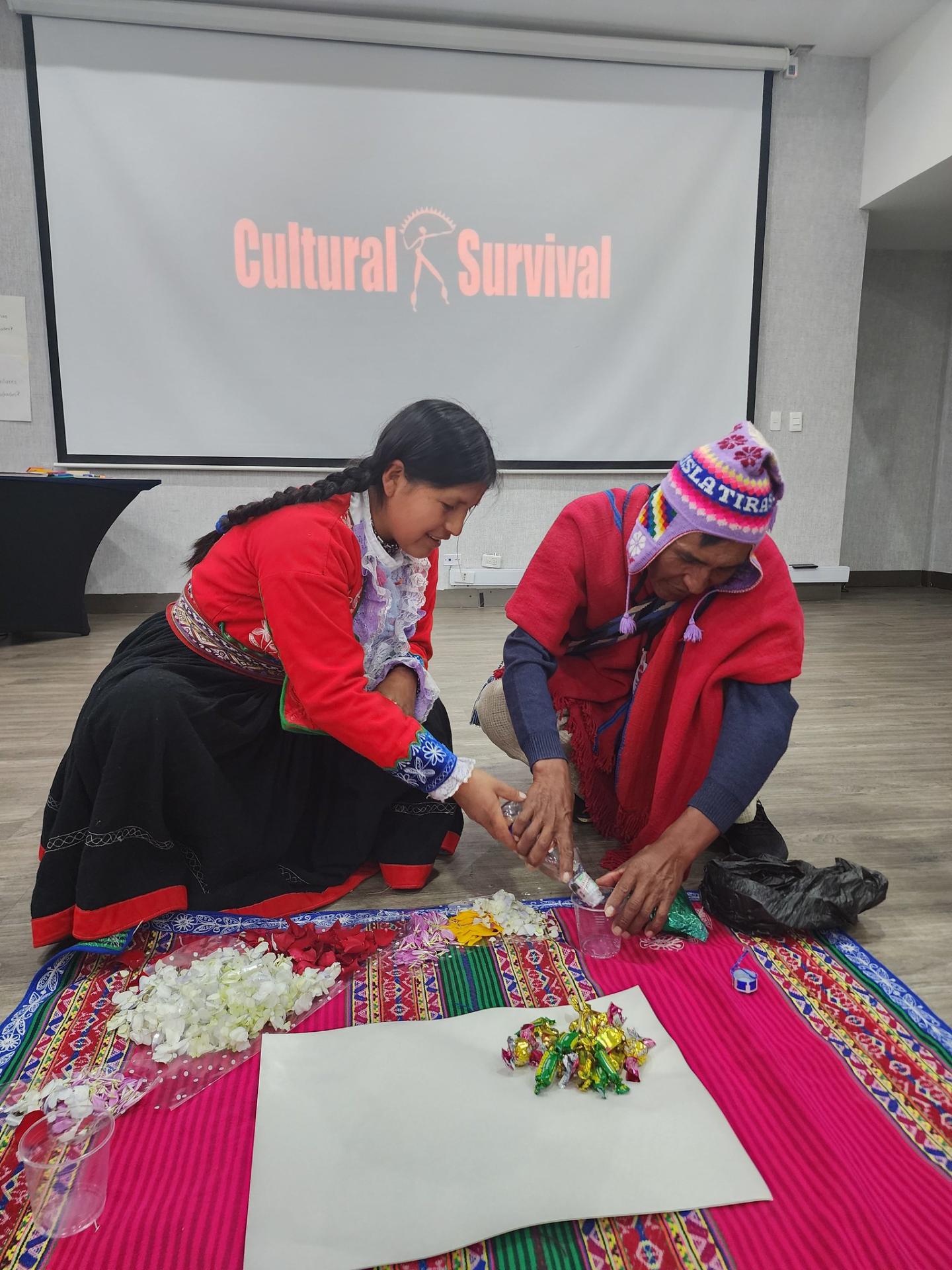 Cultural Survival hosted a space for dialogue and exchange where partners could share their experiences and learn more about the risks of climate change. Grandmother and leader Ofelia Dutcha Kuyuedo (Múrui-Muina), a member of the Indigenous council of the Ziona Amena community of Colombia, opened the gathering with an ancestral ceremony. She invoked the energies of the grandmothers and grandfathers to guide the space of thought during the three days of the workshop, thanking Mother Earth for the bounty she gives us every day and reflecting on the care and protection of the territories. Afterward, she shared traditional food and drink from her community.