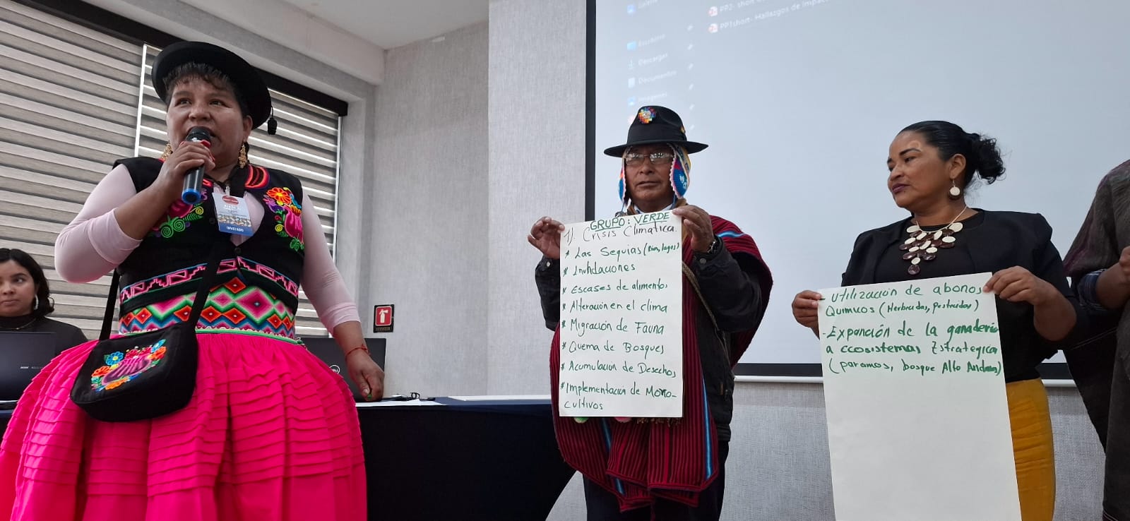 After Ruiz spoke, the working groups reconvened to discuss what Indigenous Peoples propose as a solution to the climate crisis and what measures are being developed locally to address these impacts. The participants agreed that there must be a clear and precise definition of climate change and culturally relevant systems to understand the problem and find community solutions, such as ensuring continuity with agroecological practices, diversifying reforestation, strengthening of seed banks, and use and respect for Traditional Knowledge in the care of the territories. Some visionary ideas also emerged, such as creating an environmental political training school—a measure that some communities already have in their long-term plans.