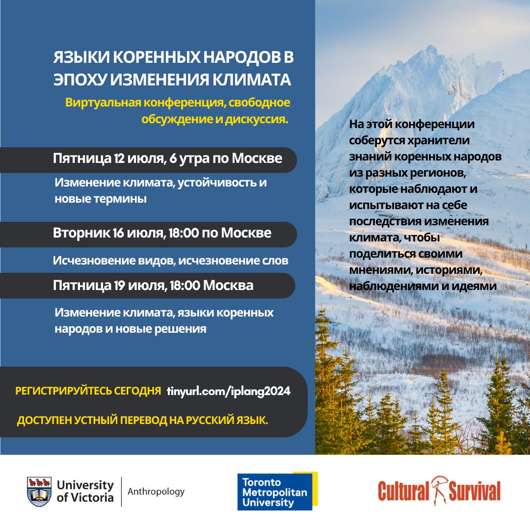3-дневная виртуальная конференция и круг общения по языкам коренных народов во времена изменения климата: 12 июля (13 в Европе), 16 июля и 19 июля, 2024 года. зарегистрироваться по этой ссылке.