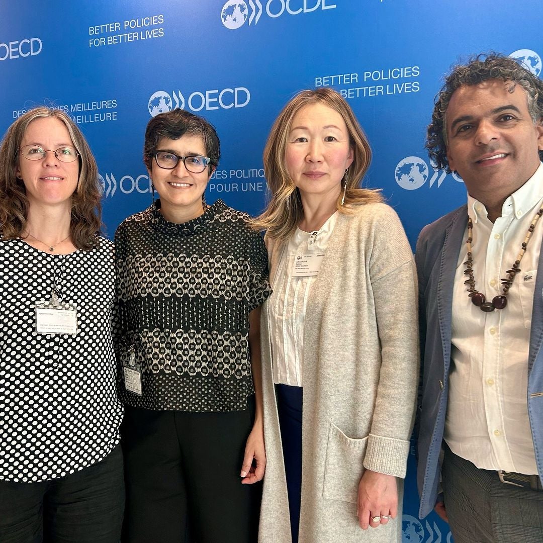 Members of the Executive Committee of the SIRGE Coalition at the OECD: Silvia Schönenberger, Programme Manager for Climate Justice and Indigenous Peoples' Rights, Society for Threatened Peoples; Payal Sampat, Mining Program Director at Earthworks; Galina Angarova (Buryat), Executive Director, SIRGE Coalition; and Edson Krenak (Krenak), Advocacy Coordinator, Cultural Survival.