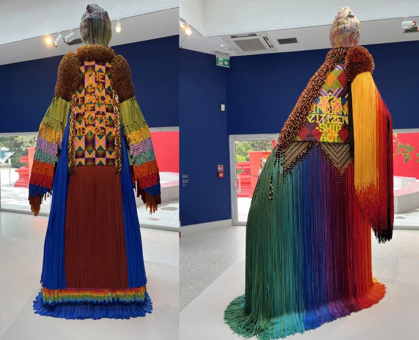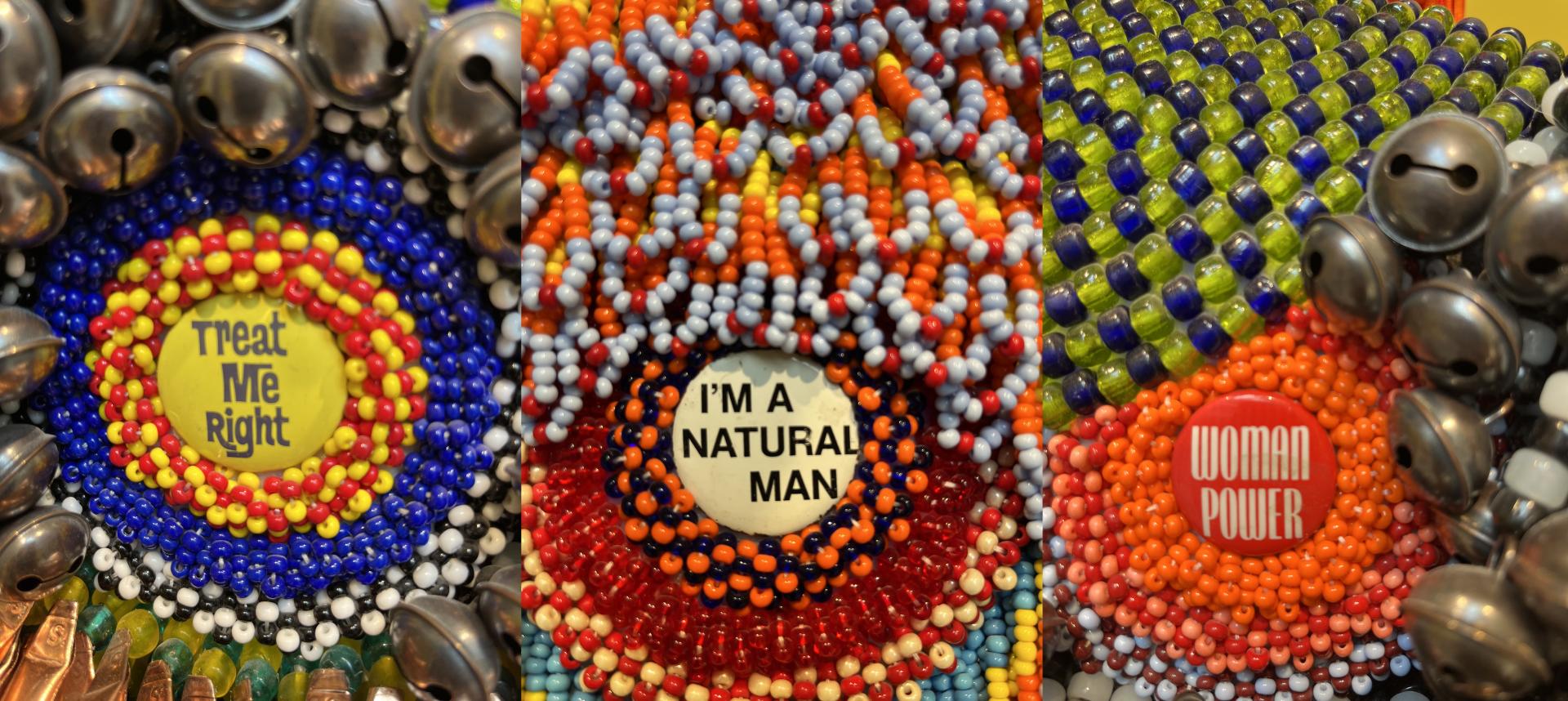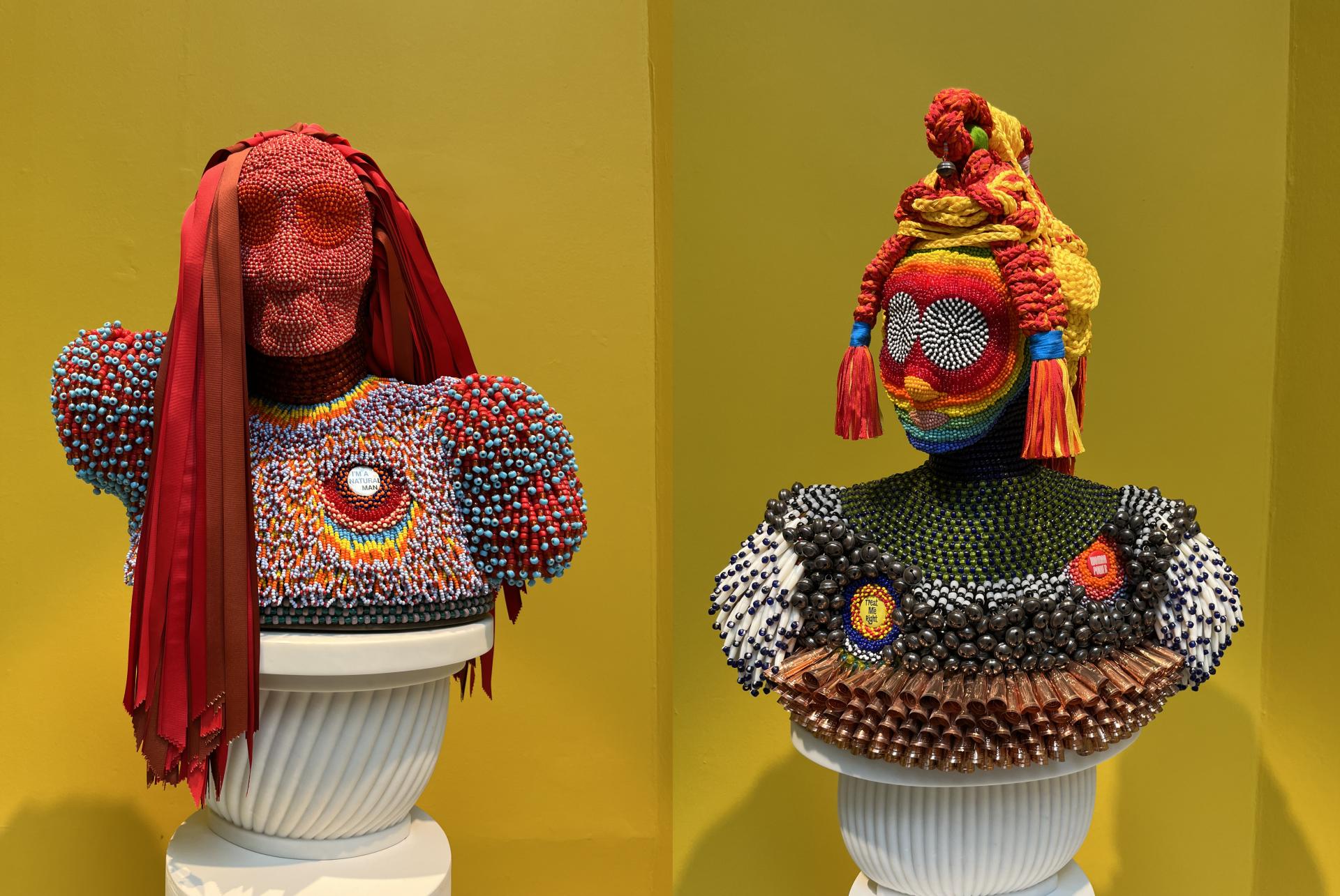 Along with towering, heavily beaded sculptures, some of Gibson’s works are smaller, more intimate busts on pedestals, such as “Treat Me Right” (2024). The beaded female figure has two small buttons on her chest with the words ‘TREAT ME RIGHT’ and ‘WOMAN POWER.’ Made of glass beads, nylon fringe, tin jingles, metal balls, plastic bone pipe beads, steel, nylon thread, and acrylic thread, the figure could be of any race or nationality; the variety of cultural hairstyles, skin colors, and clothing are a mixed hybrid of fluidity.