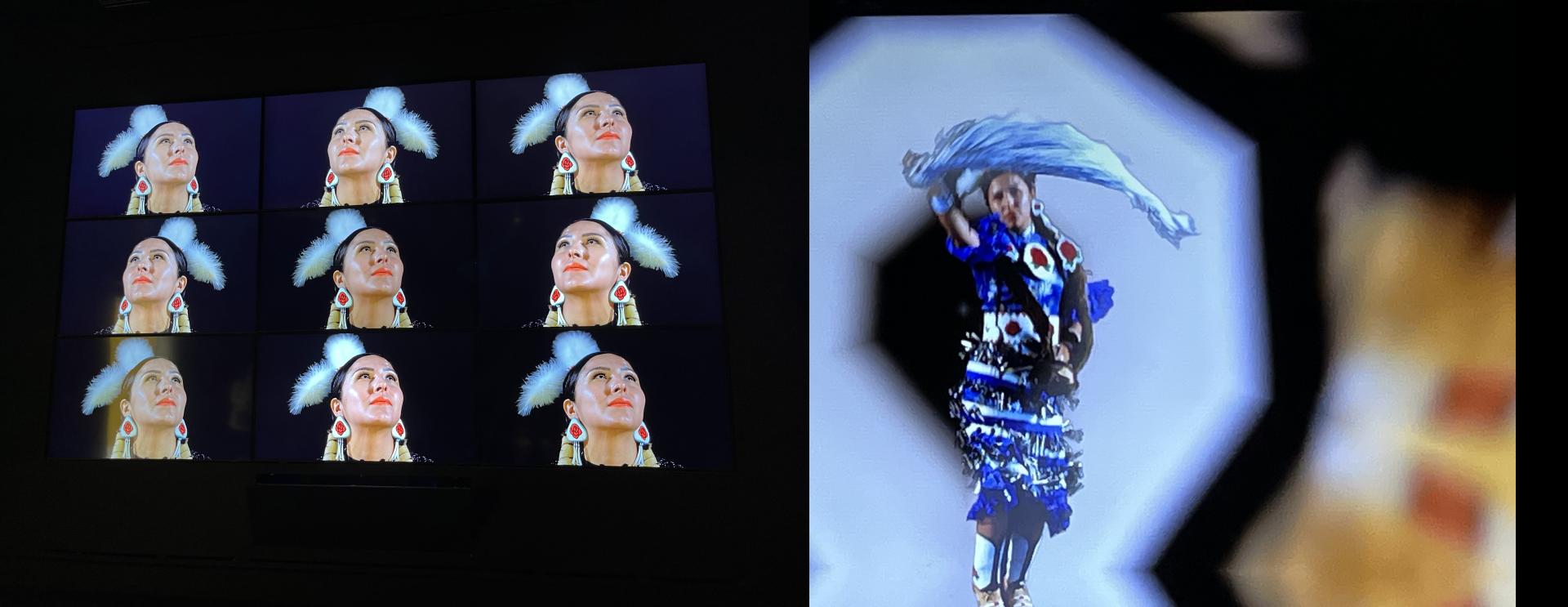 Gibson’s show is a multimedia experience. The last gallery space includes a video installation, “She Never Dances Alone,” featuring Sarah Ortegon HighWalking (Eastern Shoshone and Northern Arapaho) performing a Jingle Dress Dance to music by The Halluci Nation, a Canadian First Nations electronic music group. Images of the dancer’s face, feet, and entire body are multiplied across several screens, representing Indigenous women across generations. Closing the exhibition with upbeat music and dance reminds us to keep moving and not be static in the face of injustice, to be energetic, and to bring others along with us—for dance is a communal activity, and community is at the heart of Indigenous cultures.