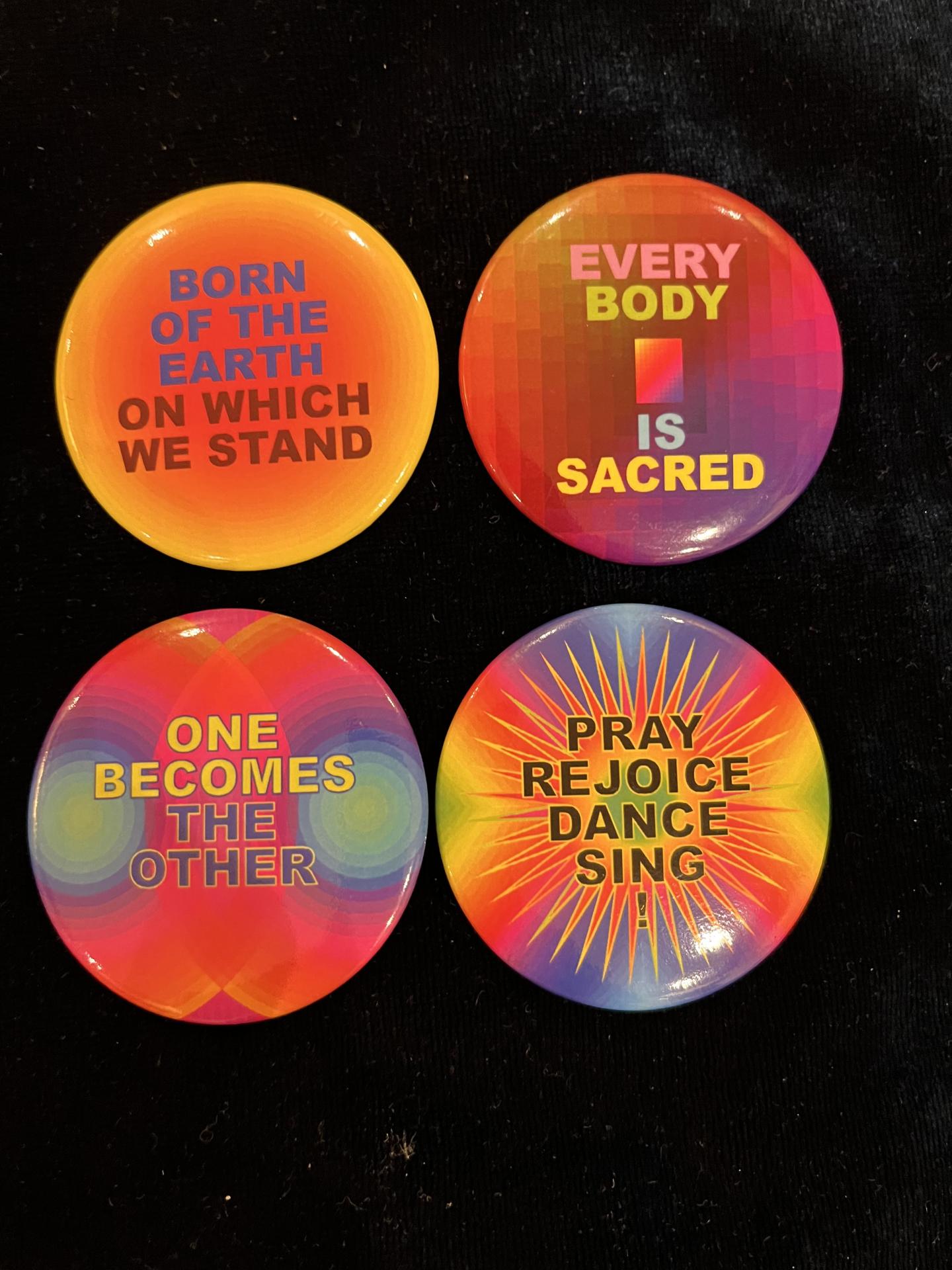 Another unique element of the exhibition was Gibson’s gift of buttons, available for visitors near the front entrance. The four titles to select from were: “Born Of The Earth On Which We Stand,” “Every Body Is Sacred,” “One Becomes The Other,” and “Pray Rejoice Dance Sing.” These words are references to themes reflected throughout the exhibition.