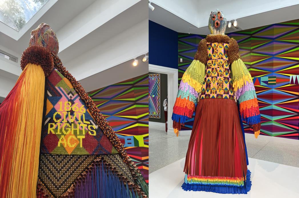 Since 2024 is a presidential election year for the United States, the significance of the historical events highlighted in some of Gibson’s sculptures and paintings is a good starting point. Two 10-foot-high sculptures in the first gallery, “The Enforcer” (2024) and “We Want To Be Free” (2024), are constructed of beads, ribbon, fringe, tin jingles, and glazed ceramic. “The Enforcer” references the 13th, 14th, and 15th Amendments of the U.S. Constitution, commonly referred to as “Reconstruction Amendments,” which abolished slavery and were supposed to protect the civil rights of formerly enslaved citizens.