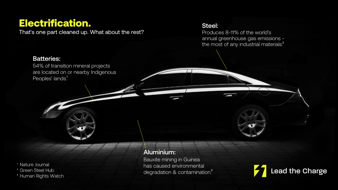 According to Lead the Charge, the transition to EVs is eliminating the biggest source of transport emissions, the tailpipe. However, as the EV transition accelerates, the emissions profile of the auto industry shifts to supply chain emissions. It is clear that automakers won't meet their climate goals unless supply chain emissions are also tackled with urgency. At the same time, the industry must tackle human rights abuses from mining, refining, and manufacturing in their supply chains. These practices not only harm workers, local communities, and Indigenous Peoples but also pollute local ecosystems and exacerbate the climate crisis.