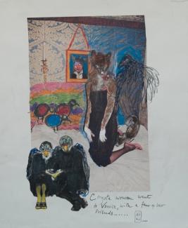 Also by Karen Kelley, “Coyote Woman Went to Venice with a Few of Her Friends”, incorporates the traditional coyote trickster into a modern setting at the Venice Art Biennale. A female trickster in high heels kneels on the floor of a gallery with a hanging painting on the background wall while a transparent eagle hovers close by. Like “Ghost Dance for Harlem”, the artist includes the past and the present, living beings, and spiritual entities.
