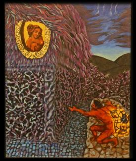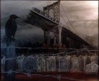 Surge Velez, also Taino, is a self-taught painter inspired by Zdzislaw Beksinski and Gerald Brom. Velez’s works depict the catastrophic, “unusualness, dark and graphic strangeness.” According to Velez, his painting “East Field” is “A vision of the future of New York City suffering from devastations such as overpopulation and biohazard outbreaks. The rivers that surround Manhattan Island have dried up and become altogether, possibly the world’s biggest cemetery, which contains the unknown. This was inspired by Potter’s Field, located on Hart Island.” With its’ dark brooding coloring, broken bridge, huge black crow, barbed wire, and rows of tombstones, viewers of “East Field” can definitely sense its’ apocalyptic mood or theme.
