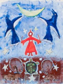In contrast, mother Karen Kelley’s works are more timeless with scenes that can be interpreted as contemporary, from the 1800’s, or from a more mythic past. “Ghost Dance for Harlem”, 2007, watercolor and acrylic on paper, 20x36”, resonates with symbolism from the 1889-1890 Ghost Dance religious movement; a spiritual gathering that involved dancing to reunite the living with spirits of the deceased to bring peace and prosperity to Native peoples. It was inspired by Wovoka’s (Paiute) prophecy of a means to end white expansion. In Kelley’s painting the sky is inhabited by two large birds, bigger than the central figure of the ghost dancer and also includes stars, crosses, and a crescent moon. The bottom of the painting incorporates images of buffaloes, profiles of Indian men, and a turtle, all well recognized Native symbols. But what distinguishes this painting from other ghost dance imagery is the modern four story Harlem apartment building. Ghost Dancers in the late 1800’s hoped to stop white expansion and have Native lands returned. Currently, white gentrification in Harlem is displacing long term Black and Latino residents.