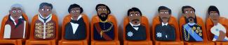 Cheng’s eight figures puppet-sculpture, “The Royal Hawaiians: From Kamehameha Nui to Lili'uokalani ” is composed of bust sized men and one woman sitting in orange chairs, dressed in colonial era Western clothing and adorned with gold military badges, sashes, and jewelry. With their brown skin, black hair, and full features they appear to be the indigenous Hawaiian royal family who have assimilated Western customs by choice, force or a combination of factors. Indigenous Hawaiian sovereignty is still a contemporary issue for activists but seldom covered in mainstream media.