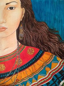 Pamela Ifandy’s “Seminole Woman”, 2014, mixed media on paper is a vibrant, colorful portrait that includes only half of the woman’s head and upper body. The patchwork blouse is easily recognizable as Seminole clothing so even without the title many viewers know what nation the woman represents. Of mixed heritage, Ifandy describes her art as “a piecing together and reclaiming of my inter-Indigenous heritage from the perspective of one born and raised in multicultural N.Y.C., several generations removed from my Indigenous ancestral communities”. The tiny pieces of fabric stitched together to create traditional Seminole clothing and a face partially obscured allude to Pamela Ifandy’s piecing together her heritage.