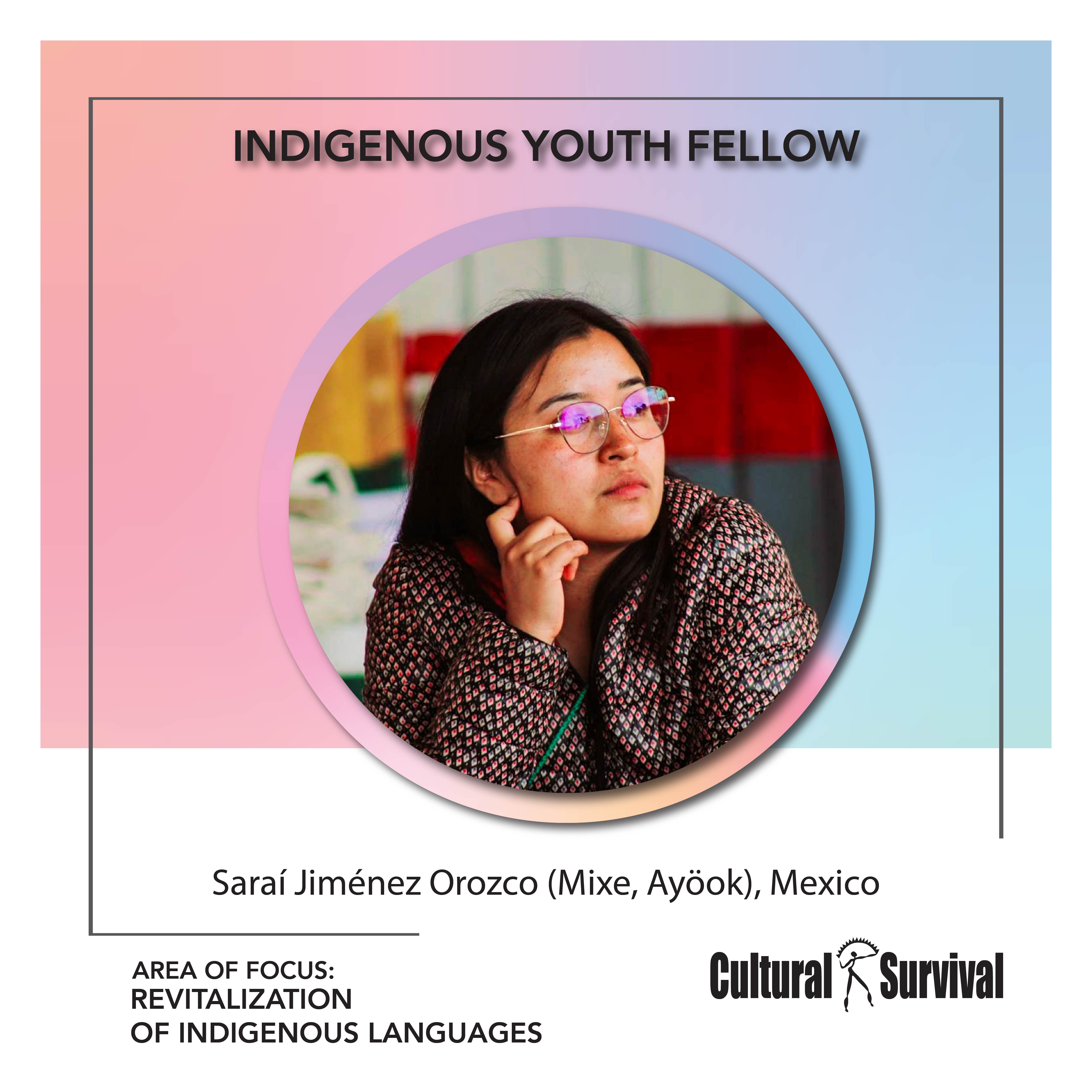 Saraí Jiménez Orozco (Mixe) is a speaker of Ayuuk from San Marcos Moctum in the municipality of Totontepec Villa de Morelos, Mixe, Oaxaca. She holds a degree in Administration and Sustainable Development from the Instituto Superior Intercultural Ayuuk A.C. of the State of Oaxaca in Jaltepec de Candayoc Mixe, where she also taught Ayuuk. She was part of the postgraduate program of the University of Deusto Spain in Human Rights in 2022, and currently collaborates with Servicios del Pueblo Mixe in the Department of Gender and Mixe Women.