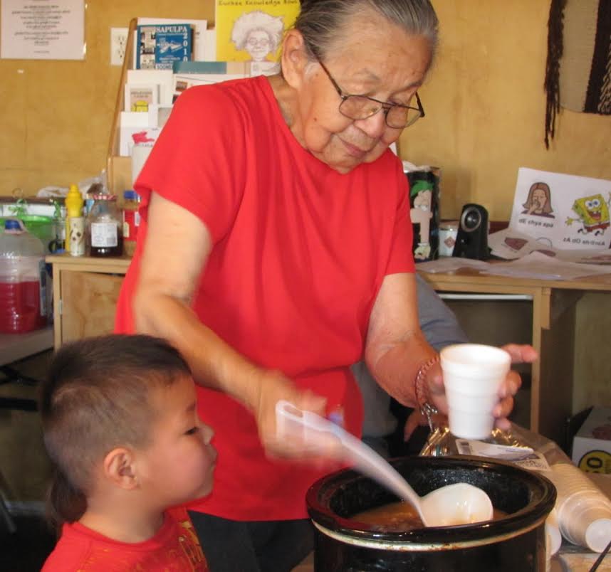 Serving zOshE (a traditional corn drink) Josephine made during class demonstration at Yuchi Language Project.
