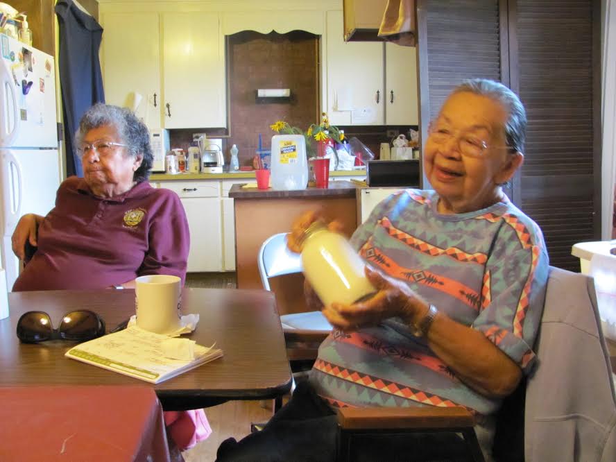 During elders language session at the Yuchi House; "butter making" demo shown with sister Maxine Wildcat Barnett.