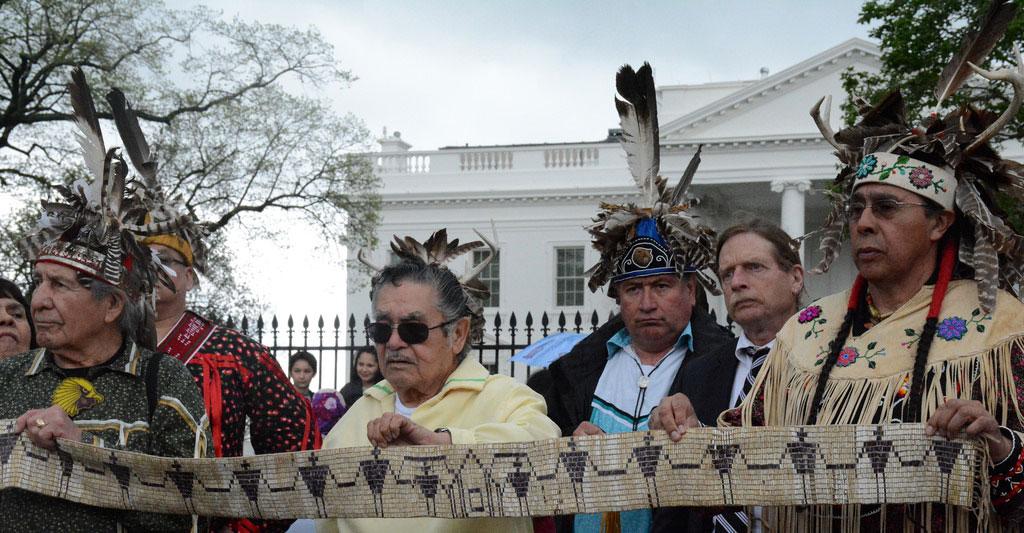 To bring attention to the filing, chiefs from the Onondaga Nation and supporters gathered at the Friends Meeting House in Washington, DC wearing traditional dress and with a historic wampum belt commissioned for the Nation by President George Washington to signify peace and friendship while ratifying the 1794 Treaty of Canandaigua.
