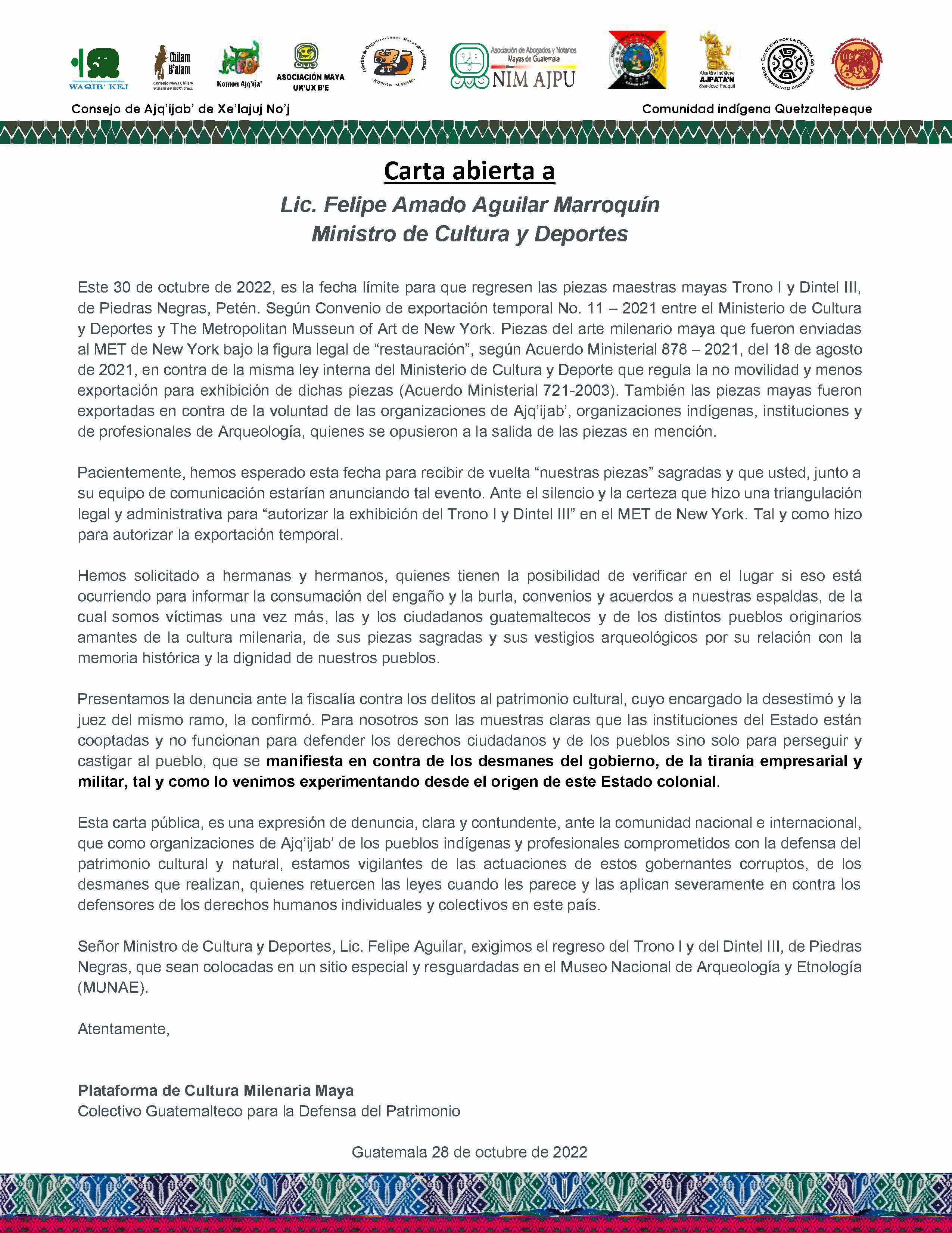 We have patiently waited for this date to receive "our sacred pieces" and for you and your communication team to announce it. Given the silence and the certainty that made a legal and administrative triangulation to "authorize the exhibition of Trono I and Dintel III" at the MET in New York and authorize the temporary export, we have asked our sisters and brothers who have the opportunity to verify the place and report the deception and mockery; agreements and agreements behind our backs, of which we are victims once again, the Guatemalan citizens and Indigenous Peoples who love our ancient culture, our sacred pieces and our archaeological remains due to our relationship with the historical memory and dignity of our people.