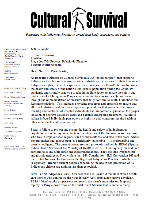 As Executive Director of Cultural Survival, a U.S.-based nonprofit that supports Indigenous Peoples' self-determination worldwide and advocates for their human and Indigenous rights, I write to express extreme concern over Brazil’s failure to protect the health and safety of the nation’s Indigenous population during the Covid-19 pandemic and strongly urge you to take immediate action to ensure the safety and protection of all Indigenous Peoples and communities, as well as Quilombolas, through the implementation of measures that fully conform to WHO Guidelines and Recommendations. This includes providing resources and protocols to ensure that all SESAI districts and facilities implement procedures that guarantee the proper tracking and treatment of infected individuals and, importantly, guarantee the proper isolation of positive Covid-19 cases and patients undergoing treatment. Failure to isolate infected individuals puts others at high risk and compromises the health of other individuals and communities.