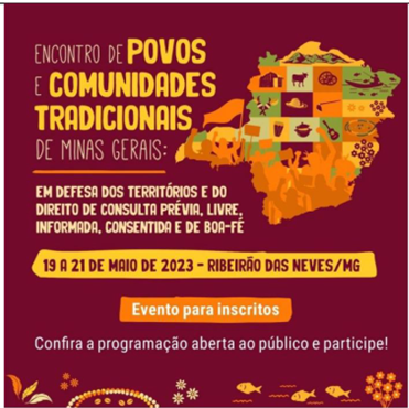 On May 19-21, 2023, representatives of many Indigenous Peoples, Quilombola communities, vazanteiros (seasonal farmers), fishermen, vacarianos (traditional cattle herders), geraizeiros (people from the Cerrado region), Romani people, carroceiros (carters), congadeiros (participants in Afro-Brazilian religious processions), reinadeiros (participants in cultural celebrations), terreiro communities, criapanhadoras de flores (flower gatherers), veredeiros (people from veredas ecosystems), chapadeiros (people from plateau regions), traditional faiscadores (gold miners), as well as civil society organizations, social movements, social pastoral groups, researchers, parliamentarians, and representatives of supporting justice institutions, gathered at the Meeting of Traditional Peoples and Communities of Minas Gerais in defense of Territories and the Right to Prior, Free, Informed, Consensual, and Good Faith Consultation.