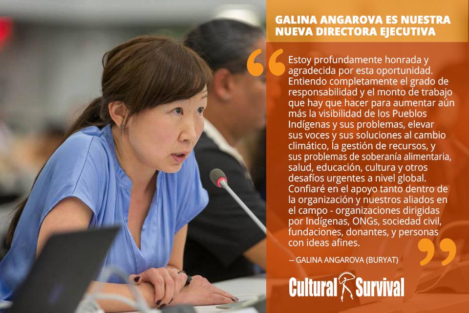 Al ser una mujer Indígena (Buryat), Galina Angarova está familiarizada con los problemas Indígenas en todo el mundo. Esperamos el liderazgo de Galina con muchas ganas, ya que apoyará la creciente presencia mundial y la eficacia en la capacidad que tiene Cultural Survival para reforzar los objetivos Indígenas de autodeterminación y autogobierno.