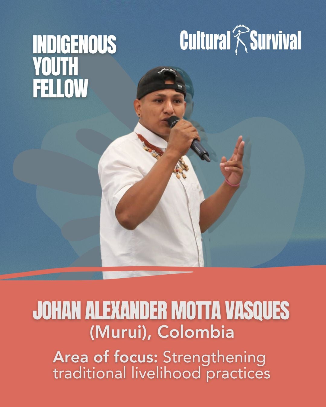 Johan Alexander Motta Vásquez est un Murui de la communauté Patio De Ciencia Dulce de Leticia, Amazonas, Colombie. Après avoir terminé ses études primaires et secondaires, qui comprenaient un programme de technicien en systèmes, la vie de Johan a été profondément marquée par deux événements survenus en 2020 : la naissance de sa fille et le début de la pandémie de COVID-19. S'appuyant sur les enseignements de ses aînés en matière de médecine traditionnelle, d'agriculture et de travaux ménagers, Johan s'est engagé sur la voie du leadership et a fondé en 2021 l'association touristique indigène Jofo Ananeko, qui vise à promouvoir la conservation culturelle et le contrôle territorial par le biais du tourisme communautaire. L'engagement de Johan en faveur de la durabilité environnementale l'a conduit à poursuivre ses études et à obtenir des diplômes en tourisme rural durable et en gestion de l'environnement en Amazonie. Sa participation à des forums nationaux et internationaux a élargi sa perspective sur la vie en harmonie et a inspiré sa candidature au poste de gouverneur de son territoire indigène en 2024, motivée par une vision de développement collectif, productif et durable pour sa communauté. Avec le soutien de Cultural Survival, Johan s'efforce de renforcer les systèmes d'approvisionnement en eau en appliquant les connaissances ancestrales et en plantant des espèces qui retiennent l'eau, pour la survie et la qualité de vie de sa communauté.