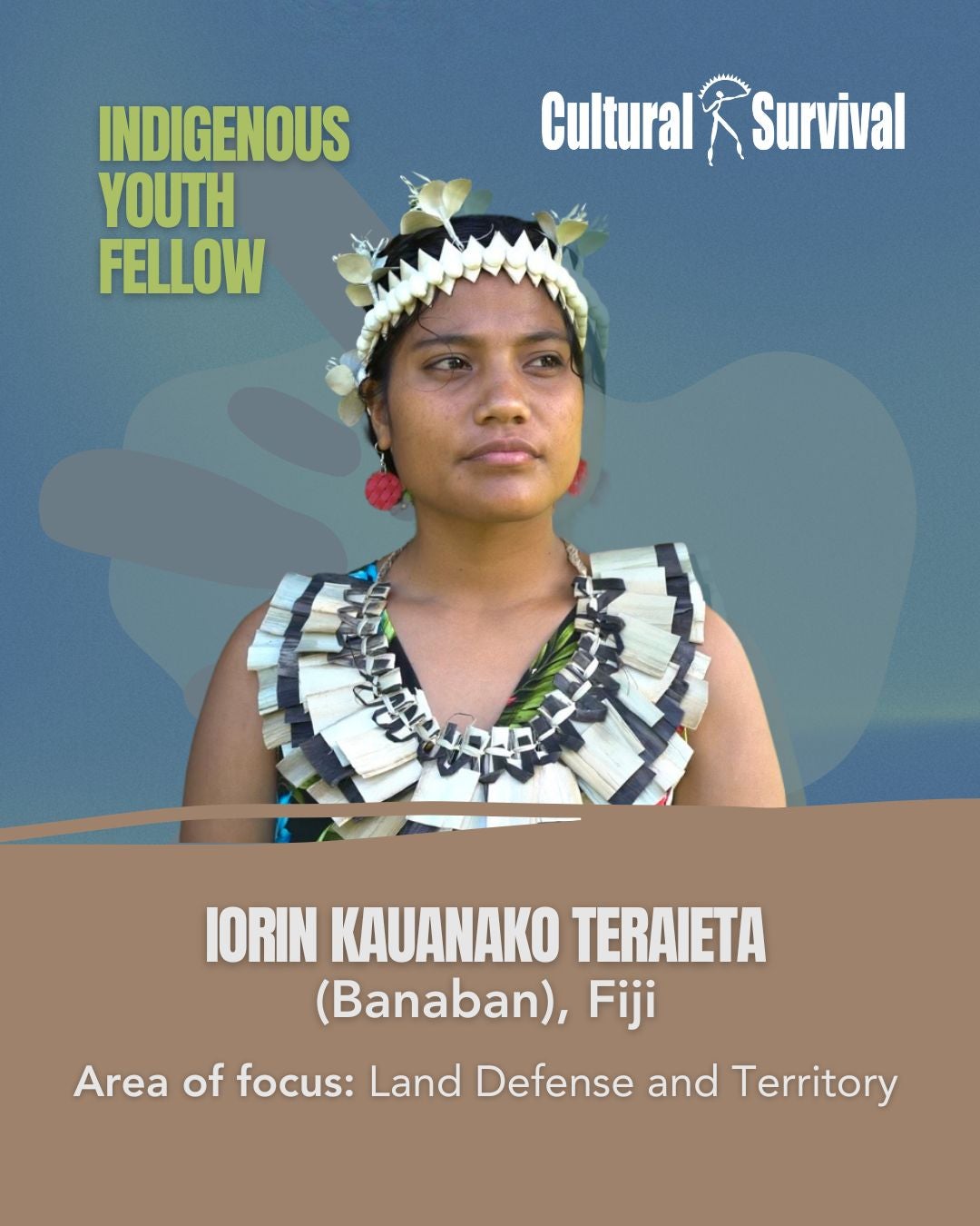 Iorin Kauanako Teraieta est une jeune défenseuse des Banabans et une travailleuse communautaire du Banaban Human Rights Defenders Network et du Rabi Island Community Hub (RICH). Elle se passionne pour la défense des droits des Banabans, la préservation de leur culture et l'autonomisation des jeunes Banabans. Iorin est le point focal du village d'Uma et la coordinatrice du programme Rich Culture and Heritage sur l'île de Rabi. Elle s'attaque à des questions urgentes telles que la crise environnementale et les impacts du changement climatique auxquels sont confrontées les communautés Banaban. Iorin s'est récemment opposée à la tentative d'une société minière australienne d'exploiter l'île de Banaba, a souligné l'importance de la consultation des communautés et du respect des ancêtres pour préserver le patrimoine des Banabans et a plaidé en faveur de la justice climatique. Son projet "Never Again. Nous disons non à l'exploitation minière : Défendre et protéger Banaba", vise à renforcer sa communauté en réponse à des intérêts miniers potentiels et à développer la solidarité et l'éducation autour de l'exploitation minière. Ces efforts sont au cœur du travail soutenu par Cultural Survival.