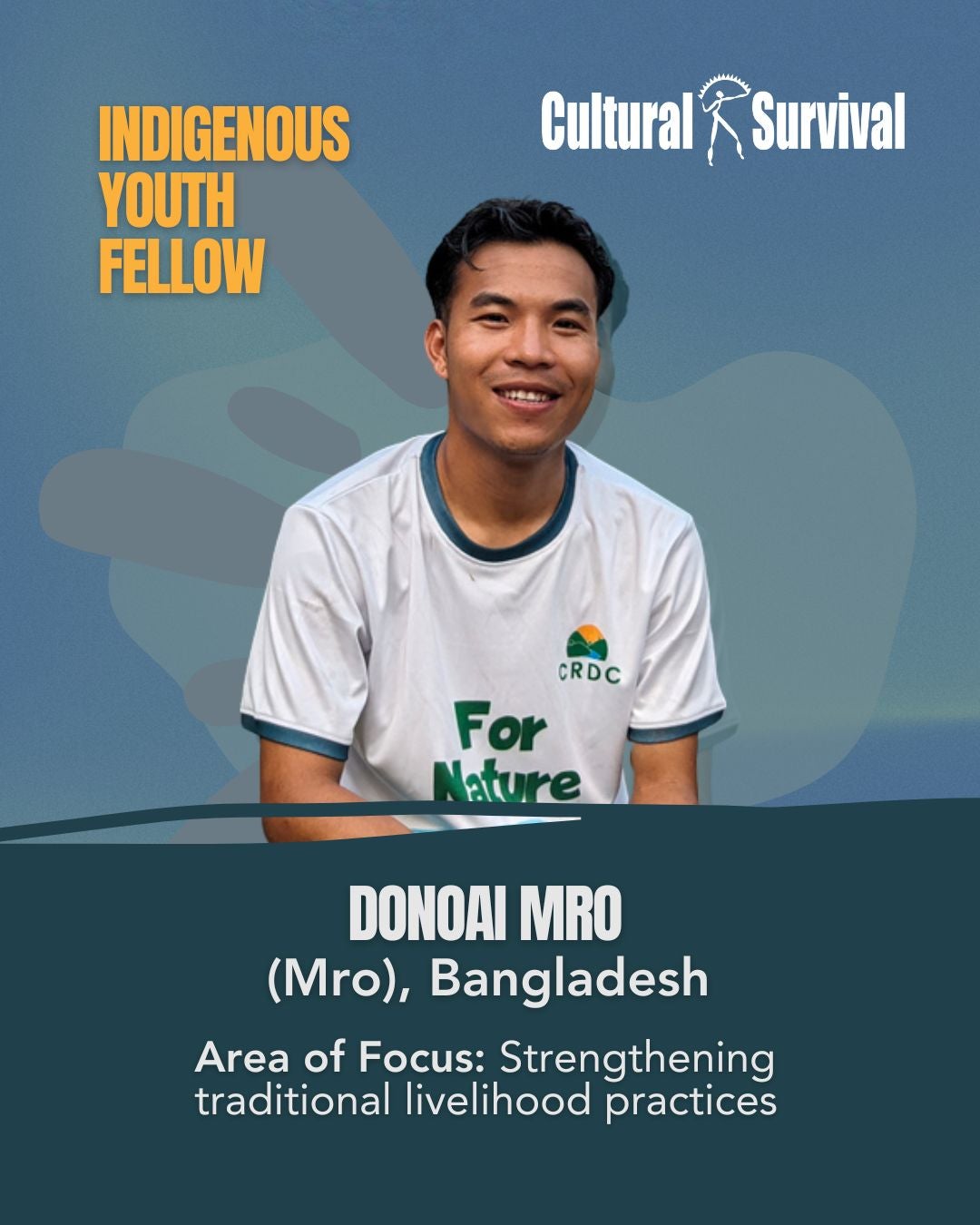 Donoai Mro, originaire des Chittagong Hill Tracts au Bangladesh, vient d'une famille d'agriculteurs. Il est diplômé de l'université de Dhaka, où il a obtenu un diplôme en criminologie axé sur la criminalité environnementale. Il est passionné par le développement durable et aime être proche de la nature. Il est également un jeune leader prometteur au sein de sa communauté et occupe actuellement le poste de secrétaire à l'information et à la publication au sein de l'association des étudiants bangladais Mro. Donoai a développé le projet "tui'piya", un mot Mro qui signifie "utiliser les connaissances indigènes", grâce auquel il utilisera les connaissances traditionnelles indigènes pour préserver les cours d'eau dans les Chittagong Hill Tracts. Le projet de Donoai consiste à renforcer la résilience de la communauté en dotant la communauté Mro des connaissances, des compétences et des ressources nécessaires pour prévenir et réagir efficacement aux catastrophes exacerbées par le changement climatique.