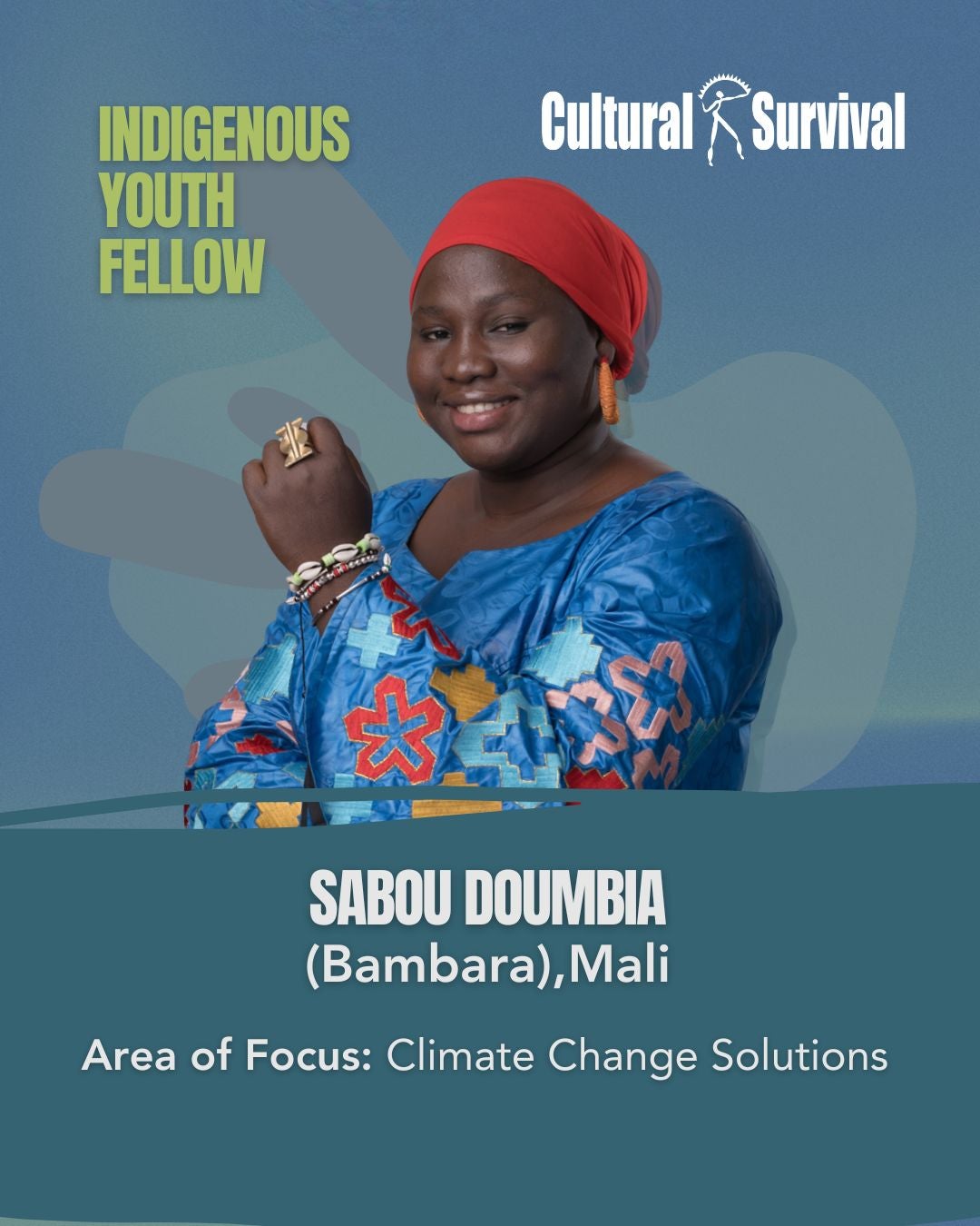 Sabou Doumbia est issue de la communauté bambara. Elle est informaticienne diplômée de l'Institut de Science et Technologie Appliquée de Bamako. Au-delà de son expertise en informatique, elle est également entrepreneure dans les domaines du développement communautaire, de la gestion de projets dans la gestion des déchets et de l'économie circulaire. Sabou est issue d'une famille nombreuse et a grandi dans un quartier où la solidarité communautaire a profondément marqué son enfance. Elle s'est consacrée à des projets de développement économique menés par la communauté. Son projet de bourse, "Préserver nos terres et nos avenirs bambaras", vise à sensibiliser les femmes du village de Siby, en particulier la communauté bambara, aux impacts du changement climatique sur leurs terres. Son initiative prône l'agriculture durable et l'utilisation d'engrais écologiques afin de promouvoir des pratiques respectueuses de l'environnement et adaptées aux réalités agricoles locales.