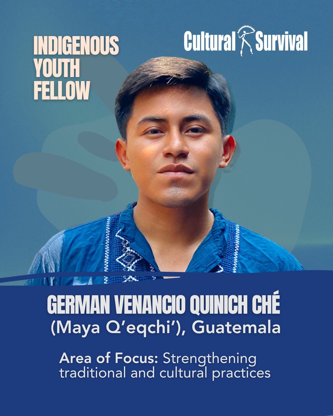 German Venancio Quinich Ché est un militant maya q'eqchi du Guatemala qui se consacre à la protection de l'environnement et des droits collectifs des peuples autochtones. Après avoir grandi dans une communauté de pêcheurs, German a obtenu un diplôme en administration et défend aujourd'hui le lac qui lui a fourni son éducation et sa subsistance. Il se bat contre une société minière qui menace le lac et les montagnes et vallées environnantes, une lutte qui a conduit à la violence, à l'emprisonnement et à la persécution de ceux qui défendent leur terre. Le projet de German, "Arte Ancestral" (Art ancestral), vise à trouver des sources de revenus innovantes sur le marché du textile et à sauver les tissages ancestraux de la région. Le projet permettra également de sensibiliser la population à ces tissages, car chaque fil est synonyme de lutte et de résistance.