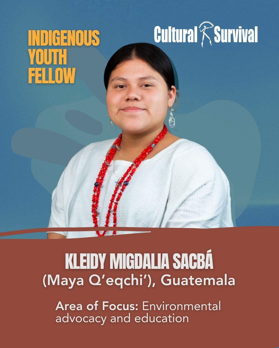 Kleidy Migdalia Sacbá Coc est une femme maya Q'eqchi' du Guatemala. Elle possède de multiples titres et a été reconnue pour son travail de promotion des droits des autochtones et de protection de l'environnement. Kleidy est une experte en ressources naturelles avec un accent sur la durabilité et étudie actuellement l'ingénierie agronomique. Elle a participé à divers forums et cours liés aux questions environnementales et au leadership transformationnel. Elle est membre de la Coalition régionale pour le droit de vivre dans un environnement sain en Amérique centrale et travaille pour Conexión Icco LatinoAmerica, qui promeut le développement et l'autonomisation des jeunes et des femmes autochtones. Elle participe également activement à des initiatives environnementales telles que des campagnes de reforestation et des actions de plaidoyer en faveur de la liberté de l'eau. En outre, Kleidy a travaillé sur des projets d'adaptation au changement climatique et promeut la participation des jeunes et la mise en œuvre d'une loi nationale sur la jeunesse au Guatemala, soulignant l'importance de l'action socio-environnementale pour les générations futures. Elle met en œuvre le projet "Q'eqchi' Xnimal Ruhil Chaq'rab'", une plateforme numérique d'éducation à l'environnement qui vise à informer les gens sur les questions environnementales.