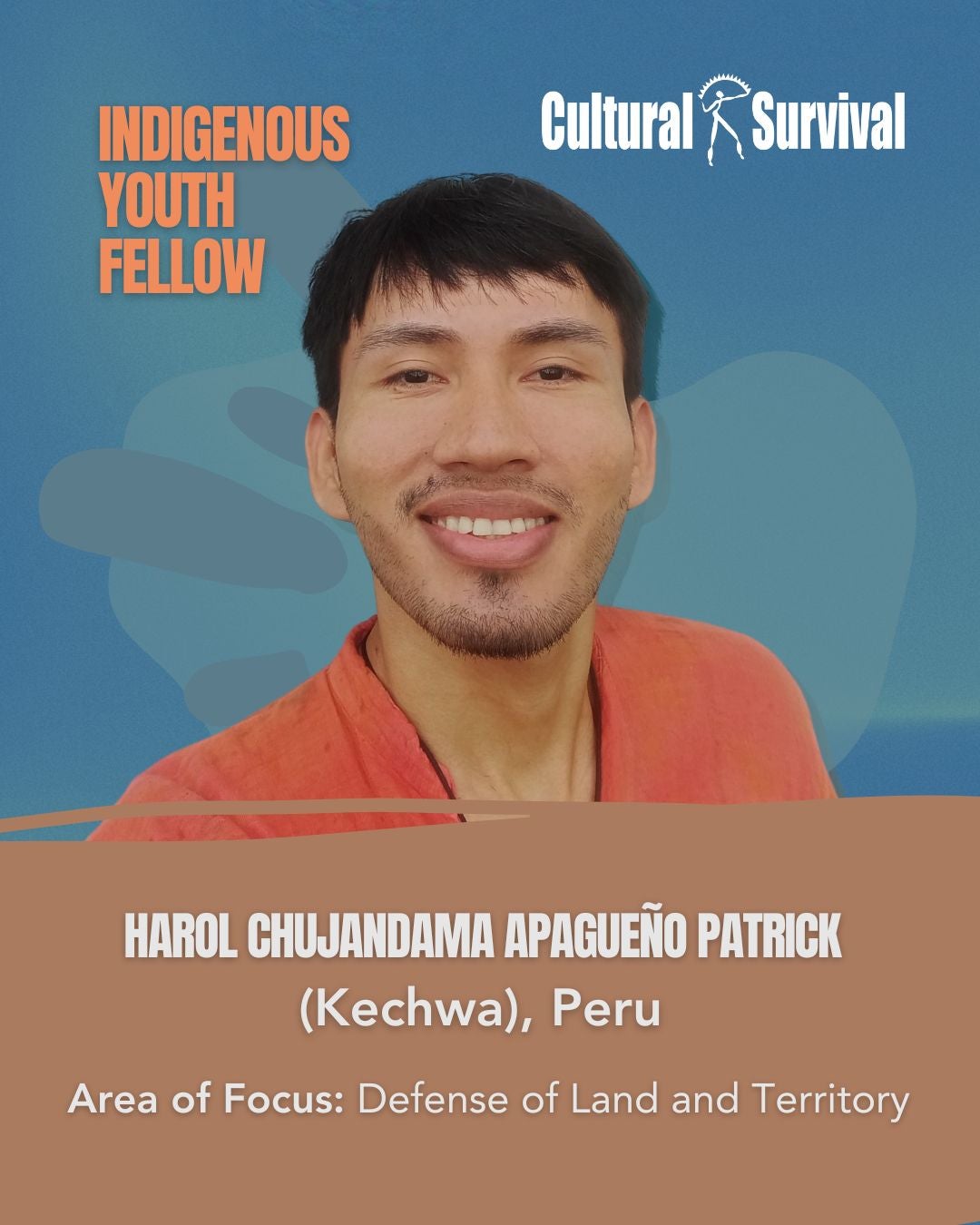 Harol Chujandama Apagueño Patrick est originaire du peuple Kechwa de l'Amazonie au Pérou. Il soutient activement sa communauté et l'organisation FEPIKECHA (Federación de Pueblos Indígenas Kechua Chazuta Amazonas), en participant à diverses formations et initiatives. Harol s'engage également dans le réseautage, le plaidoyer et l'organisation d'événements pour soutenir les droits des indigènes et la conservation des forêts. Cultural Survival soutient le projet de Harol intitulé "Visibilizar para resistir : protegiendo a los de defensores del Bajo Huallaga" (Rendre visible pour résister : protéger les défenseurs du Bajo Huallaga), qui vise à mettre en lumière les problèmes rencontrés par les communautés du Bajo Huallaga en ce qui concerne la défense de leur territoire, afin de renforcer leur résistance face aux menaces en unissant les efforts de la société civile et de l'État.