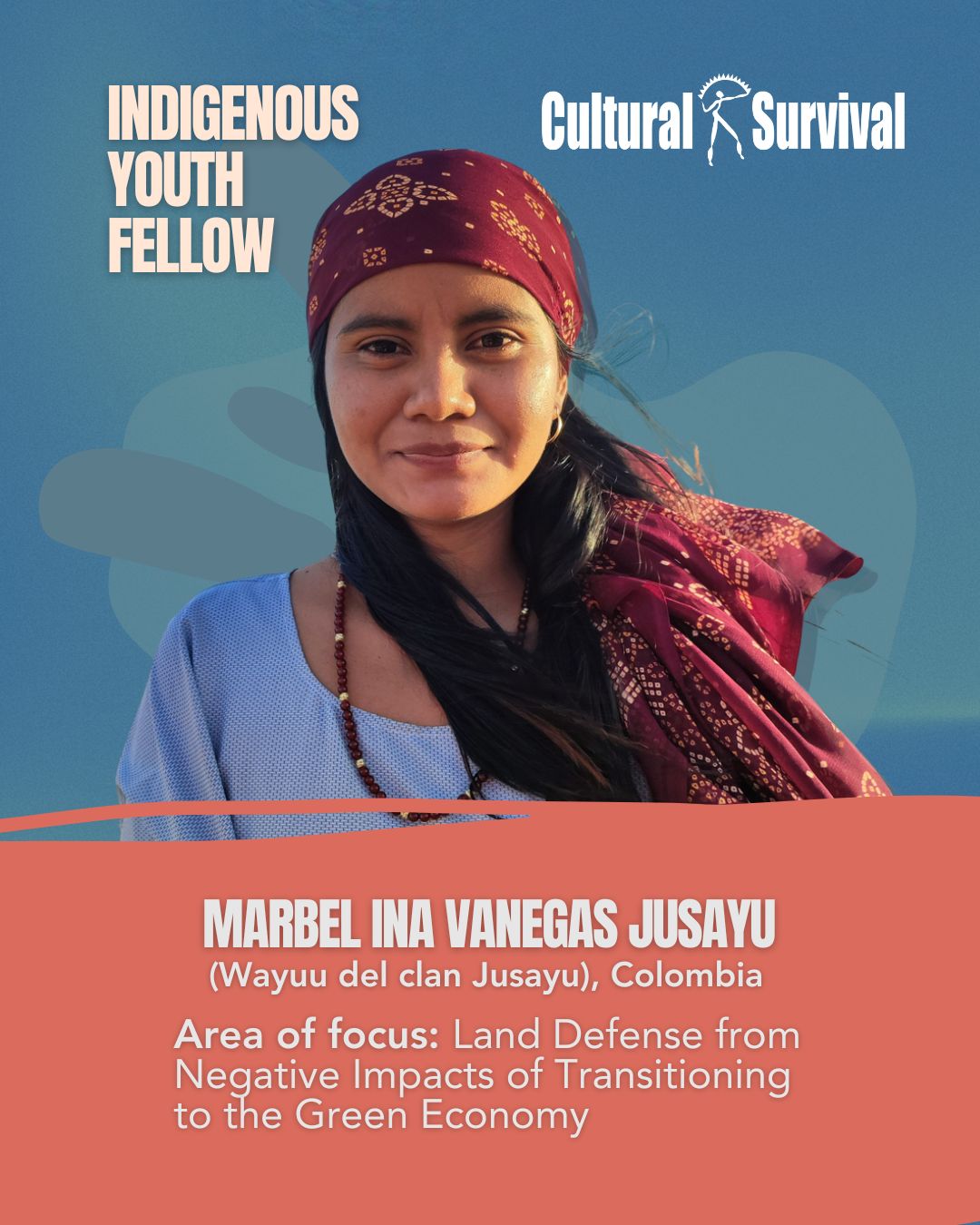 Marbel Ina Vanegas Jusayu est une Wayuu de la communauté e'iruku. Elle est communicatrice communautaire autochtone, spécialisée dans l'audiovisuel. Elle est diplômée du conservatoire de cinéma de l'École nationale de cinéma et de l'École de communication Wayuu Putchimaajana de la Guajira. Marbel est réalisatrice et productrice de contenus audiovisuels pour le cinéma et la télévision, et possède une vaste expérience au sein d'organisations autochtones dans le domaine de la radio et de la conformité technique pour la mise en œuvre de la politique publique de communication autochtone en Colombie. Avec le soutien de Cultural Survival, elle met en œuvre le projet "Ishoshi/Territorio rojo" (Territoire rouge) pour enregistrer le premier rapport audiovisuel sur la construction d'un parc éolien dans la communauté Wayuu d'Apotnojushi dans le département de La Guajira.