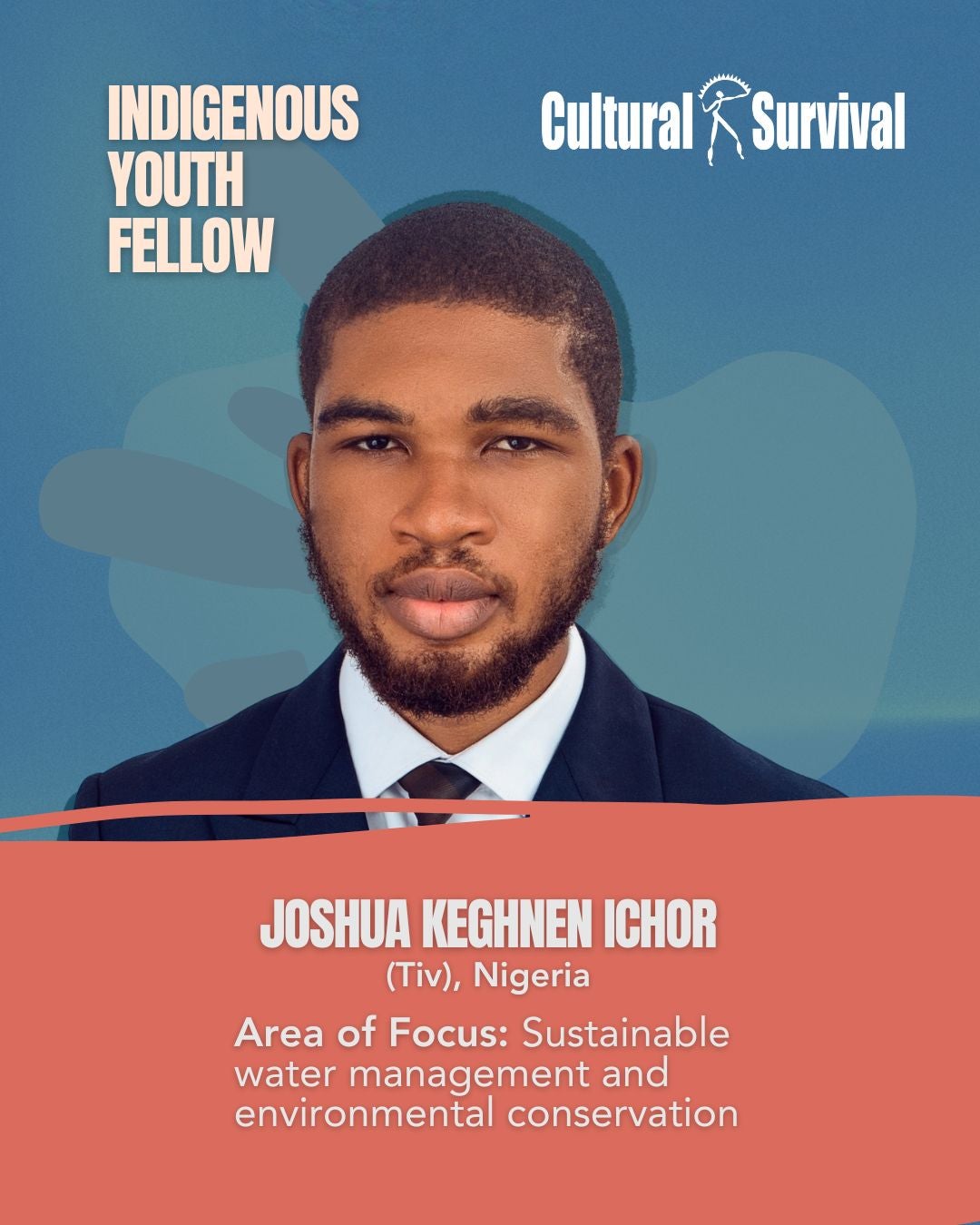Joshua Keghnen Ichor est un géologue et un expert en eau de la communauté Tiv au Nigeria. Il a consacré sa vie à la lutte contre la pénurie d'eau et le changement climatique en Afrique subsaharienne. Passionné par la durabilité environnementale et l'impact social, il s'est attaché à mettre la technologie au service de la gestion durable de l'eau et de la préservation de l'environnement. Joshua a fondé Geotek, une organisation qui propose des solutions innovantes en matière de traitement de l'eau, de surveillance des infrastructures, d'exploration des nappes phréatiques et d'adaptation au climat. Il est également activement impliqué dans des initiatives de sensibilisation et de formation visant à accroître la prise de conscience et l'autonomisation des communautés locales en matière de durabilité environnementale. Le travail de Joshua s'étend à l'échelle mondiale, puisqu'il collabore avec des organisations internationales, des instituts de recherche et des agences gouvernementales pour faire progresser le domaine de l'eau et de la résilience climatique. Ses efforts ont été récompensés par des prix prestigieux, notamment le Young Climate Prize et le Swarovski Creative Prize. Cultural Survival soutient son projet "The Geotek Water", qui s'adresse essentiellement à la tribu Tiv et à d'autres communautés touchées dans le nord du Nigéria, afin de créer un système sophistiqué de surveillance et de gestion de l'eau alimenté par la technologie.