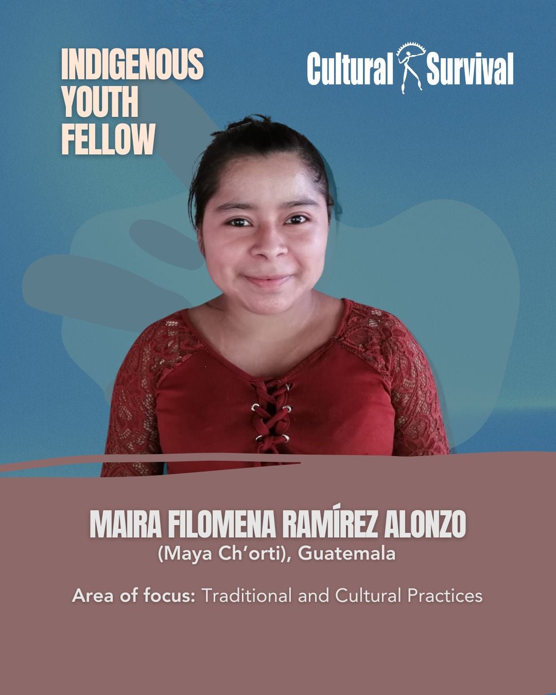 Maira Filomena Ramirez Alonzo est une Maya Ch'orti' d'Olopa Chiquimula, au Guatemala. Elle est artisane, défenseur des droits de l'homme, communicatrice communautaire et membre du Conseil indigène Maya Ch'orti' d'Olopa. Elle a participé à l'organisation de la communauté, notamment à la récupération des terres, des forêts, des rivières et des sources d'eau, ainsi qu'à la préservation de sa culture. Maira est activement engagée dans la résistance à l'exploitation de la terre par les compagnies minières, ainsi que dans la défense des droits et du bien-être de sa communauté aux niveaux local, national et international. Elle est passionnée par la préservation de son héritage culturel, en particulier par la fabrication artisanale de produits en fibre de maguey à l'aide de teintures naturelles, une tradition transmise par sa mère et ses grands-mères. Elle est convaincue que les pratiques de son peuple peuvent contribuer à résoudre des problèmes mondiaux tels que le changement climatique. Son projet, "Rescante de nuestras raíces y conocimiento de la artesanía de maguey del pueblo Maya Ch'orti" (Sauvetage de nos racines et connaissance de l'artisanat du maguey du peuple maya Ch'orti), vise à récupérer les connaissances ancestrales du peuple maya Ch'orti' de la communauté de Tituque Olopa, Chiquimula.