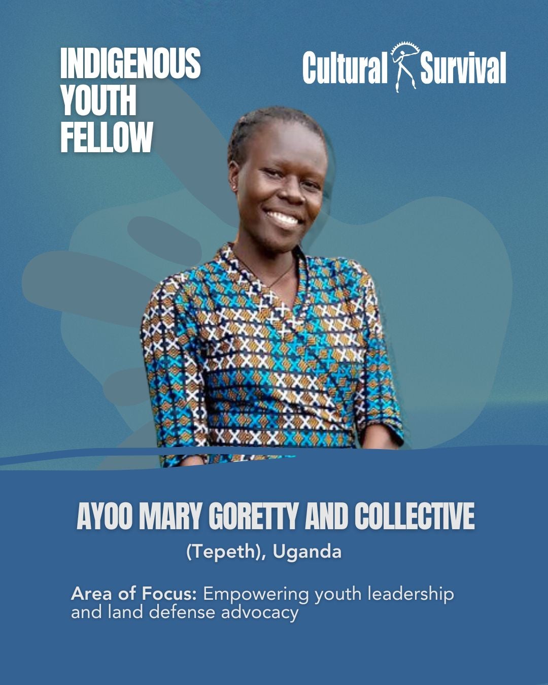 Ayoo Mary Goretty est originaire de la communauté de Tepeth, dans le district de Moroto. Elle est une avocate et travailleuse du développement communautaire activement engagée dans diverses activités communautaires. Elle aime interagir avec les jeunes, en particulier avec les personnes handicapées. Ayoo est inspirée par la volonté de sa communauté d'apprendre et de se transformer en citoyens responsables qui apprécient leurs traditions Tepeth.