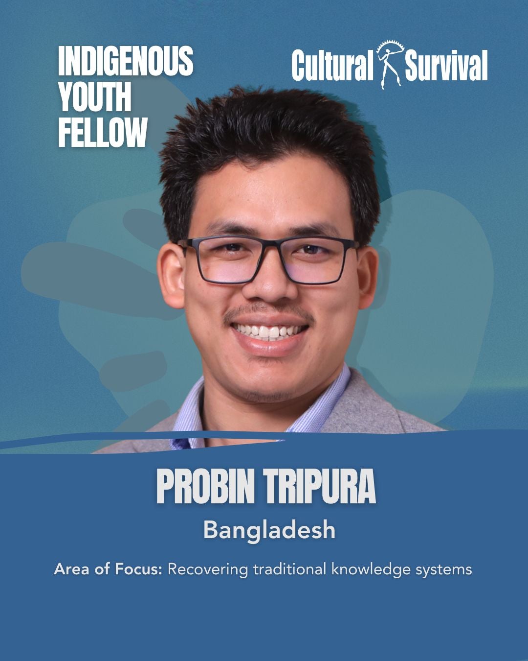 Probin Tripura est un jeune activiste et défenseur du climat issu de la communauté Tripura au Bangladesh. Il prépare actuellement un diplôme de troisième cycle en études du développement à l'université BRAC. Probin est l'un des principaux membres de l'initiative YARWNG, dirigée par des jeunes autochtones, où il dirige l'équipe chargée de l'environnement et de la justice climatique dans le cadre du mouvement « Back to the Roots » (retour aux sources). Il participe également à de nombreuses autres activités liées à l'action climatique et a suivi une formation en organisation communautaire à Sabah, en Malaisie, organisée par PACOS Trust et soutenue par le Pacte des peuples autochtones d'Asie. Probin a reçu plusieurs prix pour son travail, notamment le DYDF Youth Icon Award 2022 de la Dhrubotara Youth Development Foundation et le Women's Peace Ambassador Award 2021 du Centre for Peace & Justice, BRAC University, et de UN Women Bangladesh. Il mène actuellement un projet sur l'organisation communautaire dans deux villages indigènes de Khagrachari, au Bangladesh. Probin et son équipe mettent en œuvre un projet visant à promouvoir les connaissances traditionnelles autochtones pour trouver des solutions durables au changement climatique dans les Chittagong Hill Tracts, au Bangladesh.
