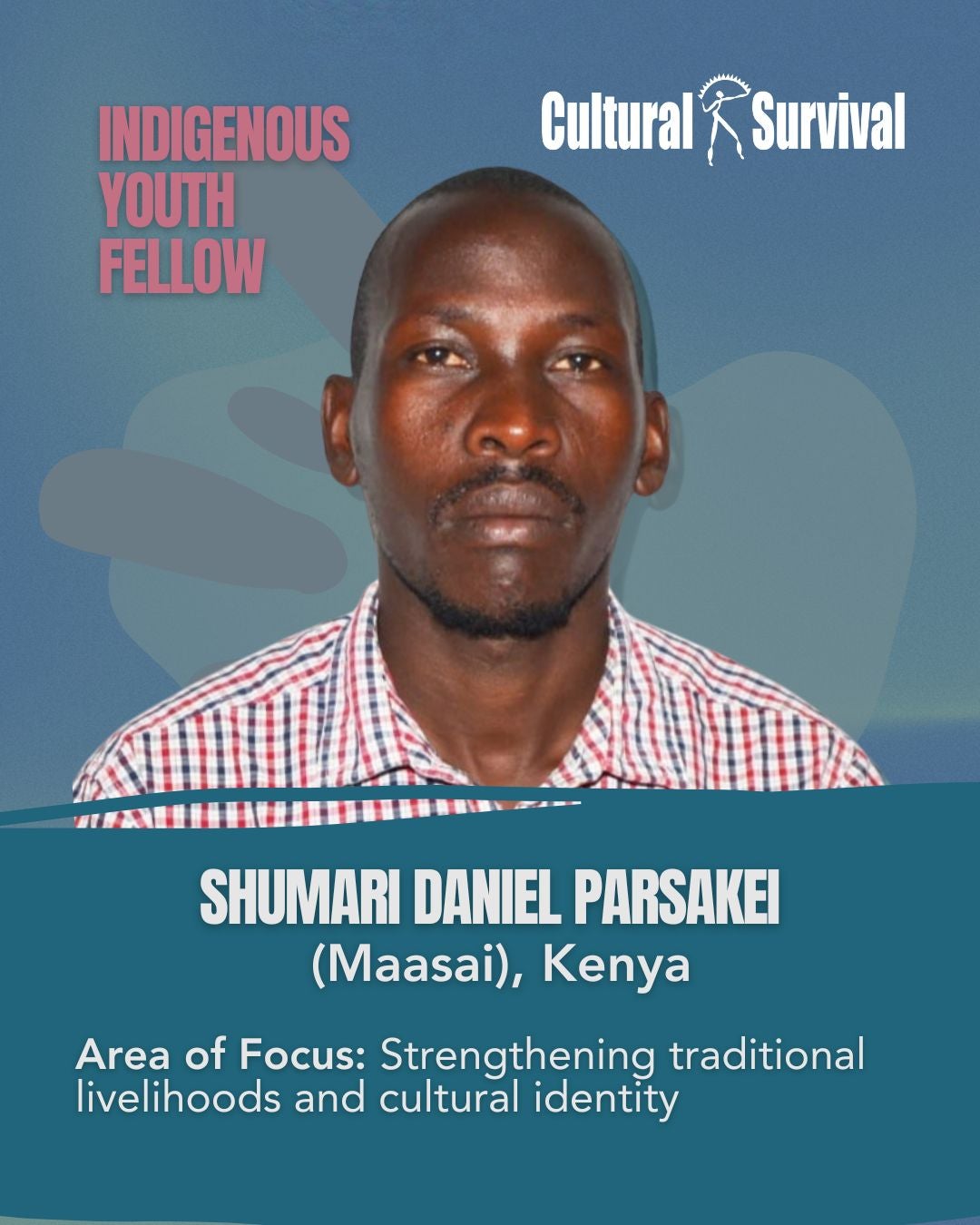 Shumari Daniel Parsakei est un jeune de la communauté Masai au Kenya. Il est activement impliqué dans des organisations de jeunesse à Trans Mara, dans le comté de Narok, et a récemment obtenu une licence en conservation de l'environnement et en gestion des ressources naturelles à l'université de Nairobi. Shumari travaille comme agent de vulgarisation et de coordination au niveau communautaire où il s'engage avec les jeunes de la communauté, facilitant les programmes sur l'agriculture durable en réponse à la disponibilité réduite des terres à la maison, promouvant le transfert des connaissances traditionnelles intergénérationnelles, et abordant les questions liées au changement climatique.